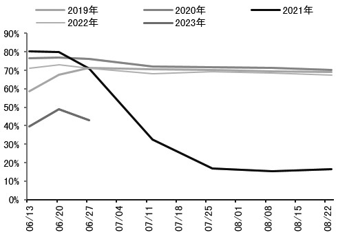 图为澳大利亚干旱监测 澳大利亚方面,受厄尔尼诺现象的影响,澳大利亚往往发生干旱,所以今年澳大利亚菜籽减产预期较强。美国农业部7月供需报告维持澳大利亚2023/2024年度菜籽单产和产量分别为1.4吨/公顷(上年为2.13吨/公顷)和490万吨(上年为830万吨)的预测,同比分别下降34.27%和40.96%。从主要变量来看,澳大利亚菜籽种植面积小幅下降,菜籽单产大幅调低,二者共同导致本季澳大利亚菜籽预期产量大幅减少。从澳大利亚降水预报来看,未来一周,澳大利亚菜籽产区降水仍然偏少。因此,澳大利亚菜籽单产维持低水平的概率较大,菜籽减产预期也较强。 [美豆供需呈现趋紧局面] 尽管美国农业部7月供需报告未下调美豆单产,美豆产量和库存高于预期,但美豆种植面积下调基本奠定了供需趋紧的格局,且目前美豆优良率较低,后期美豆单产下调概率仍然较大。从美豆种植面积调整规律来看,美国农业部8月供需报告存在小幅上调美豆种植面积的可能,但上调幅度预计不大。 从美豆单产调整特征来看,过去10年,美国农业部有两次在7月供需报告中下调美豆单产。考虑到今年美豆种植偏早且顺利,美豆优良率处于往年同期最低水平,所以在8月供需报告发布前,市场预计美国农业部将在报告中下调美豆单产至51.4蒲式耳/英亩。不过,美国农业部7月未对美豆单产进行调整也符合客观现实和其调整的规律特征,因为美豆尚处于生长早期,前期的干旱是否对美豆生长和单产造成实质性影响还有待验证,并且后期天气仍存在较大不确定性。此外,截至7月9日当周,美豆优良率仅为51%,处于往年同期最低水平,若未来一个月美豆优良率不能快速改善,那么美国农业部在8月供需报告中下调美豆单产的概率较大。因此,在美豆种植面积下调、美豆优良率较低的背景下,后期油脂油料将易涨难跌,而天气将成为影响市场节奏的重要因素。 [马棕季节性增产概率较大] 马棕6月产量低于预期,且累库速度放缓,上半年马棕产量同比略降约2.3%。考虑到近年来马棕榈树种植和收获面积持续下降,单产也呈现回落趋势,预计2023年马棕产量增幅低于原有预期,或在50万吨左右,即2023年马棕产量预期在1900万吨左右,同比增加约3%。不过,从棕榈油生产季节性角度来看,今年7—10月马棕仍呈现季节性增产的可能性较大。而从产量同比角度来看,预计马棕产量同比增加幅度有限。