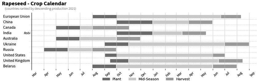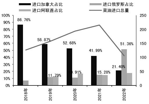 图为国内三大油脂价差走势[元/吨] [主产国菜系出口高峰已过] 从我国菜系进口结构来看,我国菜籽进口仍集中于加拿大,但我国菜油自俄罗斯进口占比明显提升。从全球菜籽种植周期来看,加拿大菜籽种植周期为5—6月种植,8—10月收获;俄罗斯菜籽种植周期为4—5月种植,8—9月收获。因此,在10月之前,加拿大菜籽出口情况和俄罗斯菜油出口节奏对我国菜系供应将有较大影响。
