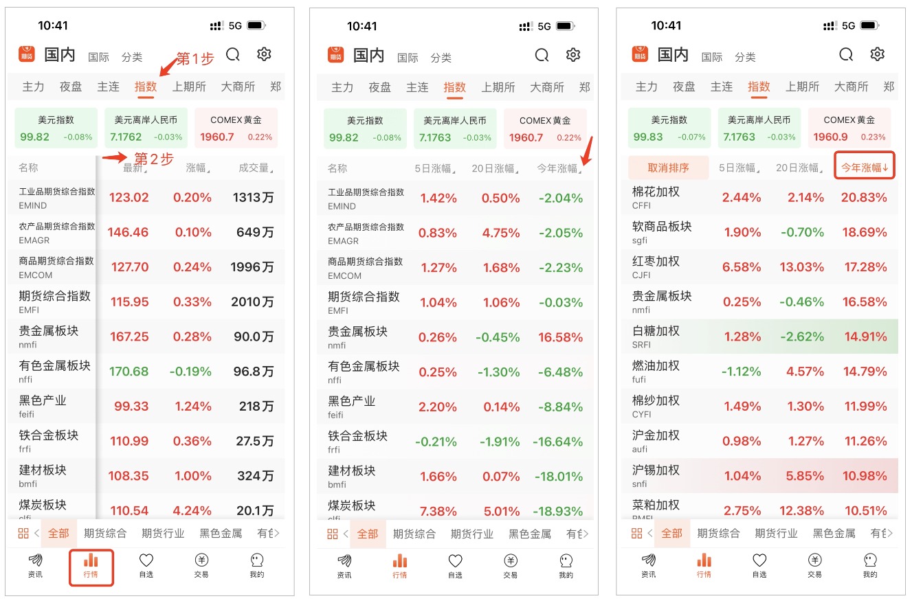 ![]() 注:取品种加权指数上半年涨跌幅前十进行排序 ![]() 数据来源:东方财富Choice 今年累计涨跌幅可在东方财富期货APP上查看,具体路径如下: 在东方财富期货APP的行情页点击【指数】,向左滑动行情区域至最右侧,点击【今年涨幅】右下角的灰色三角图标,则此列数据会按照今年涨幅降序排列(图标变为箭头向下↓),再次点击则按照今年涨幅升序排列(图标变为箭头向上↑),点击【取消排序】则恢复默认状态,5日涨幅、20日涨幅使用方法同今年涨幅。 ![]() (文章来源:东方财富研究中心) (责任编辑:admin) |
