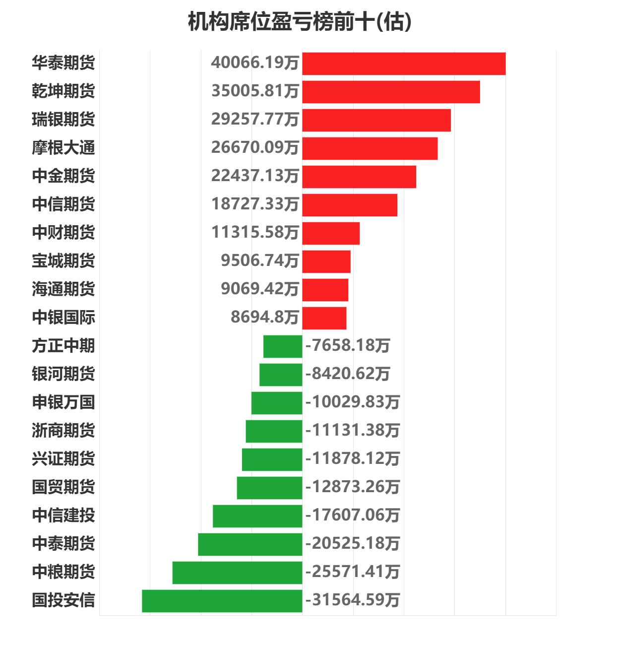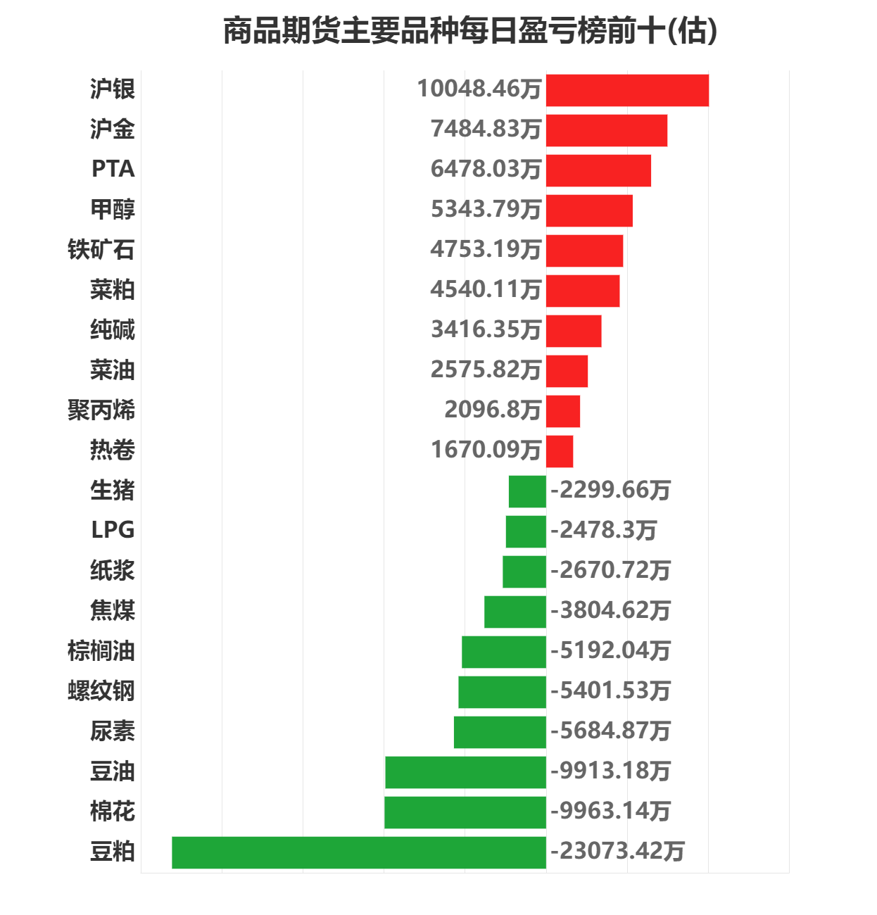 每日期货龙虎榜,带你深度了解市场。 市场一览:周四商品期货综合指数上涨0.64%,日内资金净流入54.81亿元。 市场成交量为3532.35万手,成交额为2.08万亿元。 持仓量为4302.32万手,较前一交易日增加38.74万手。 市场成交量前十和持仓量前十如下图所示: ![]() ![]() ![]() 品种盈亏榜:今日商品期货中沪银盈利第一,为10048.46万元。 豆粕亏损第一,为23073.42万元。 ![]() 就沪银而言,今日盈利前三席位为中财期货、国投安信、广发期货,分别盈利4819.87万元、1562.05万元、1459.60万元。 今日亏损前三席位为东兴期货、五矿期货、南华期货,分别亏损2334.07万元、1308.85万元、1185.33万元。 ![]() 就豆粕而言,今日盈利前三席位为华泰期货、南华期货、乾坤期货,分别盈利7240.33万元、4029.93万元、3244.81万元。 今日亏损前三席位为国投安信、中粮期货、浙商期货,分别亏损11798.23万元、9475.14万元、6060.03万元。 ![]() 席位盈亏榜:今日机构席位中华泰期货盈利第一,为40066.19万元。 国投安信亏损第一,为31564.59万元。 ![]() 就华泰期货席位而言,今日盈利前三品种为中证500股指、豆粕、铁矿石,分别盈利18817.11万元、7240.33万元、4389.22万元。 今日亏损前三品种为菜粕、玻璃、生猪,分别亏损3470.85万元、1887.62万元、982.20万元。 ![]() 就国投安信席位而言,今日盈利前三品种为沪银、玻璃、纯碱,分别盈利1562.05万元、1023.91万元、993.47万元。 今日亏损前三品种为豆粕、豆油、中证500股指,分别亏损11798.23万元、9347.66万元、9279.61万元。 ![]() 注:可通过点击东方财富期货APP资讯页面“龙虎榜”及东方财富期货PC端左侧“龙虎榜”查看各类机构持仓及盈亏榜单信息。 ![]() ![]() 以上图表数据来源:东方财富Choice (文章来源:东方财富研究中心) (责任编辑:admin) |