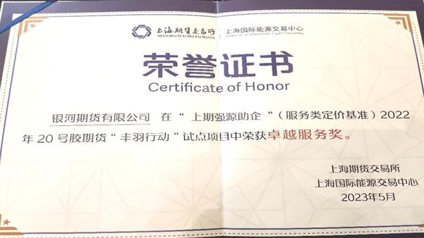 银河期货积极参加由上海期货交易所开展“强源助企”20号胶期货“丰羽行动”试点项目,助力INE20号胶期货价格国际影响力大幅提升。在服务产业客户过程中,银河期货引导客户运用INE20号胶期货作为长协贸易的定价基准,替代原本的新加坡SICOM市场的TF合约,累计为16000吨现货实现定价贸易,管理价格风险,控制经营成本,与客户一道为推进“中国价格”国际化贡献力量。2023年5月,银河期货被上期所授予“卓越服务奖”。