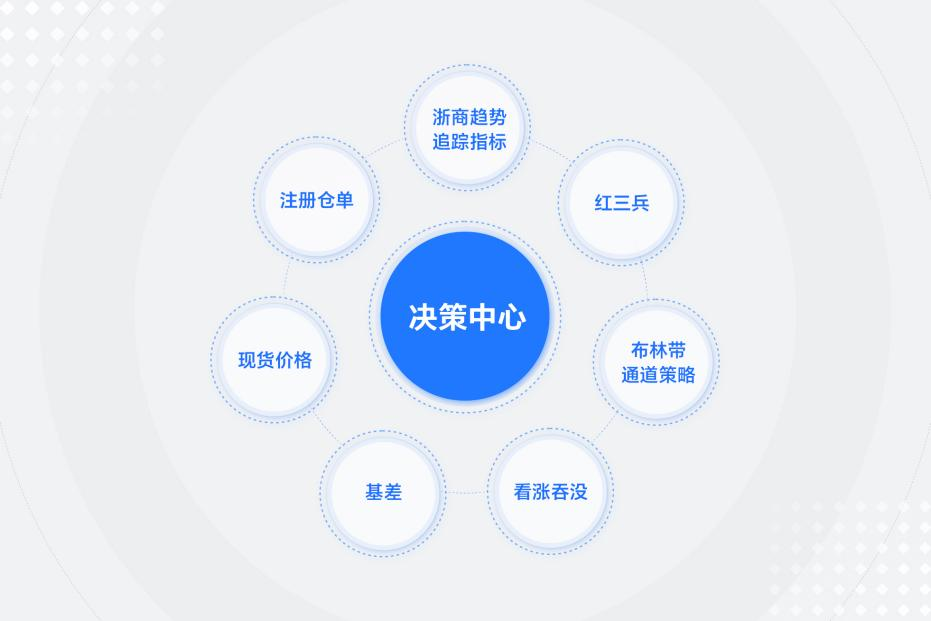 浙期汇App从海量的市场数据中快速提取、分析有效信息,构建强大的数据模型和算法中心,打造了决策中心模块,为用户提供“浙商趋势追踪指标”、“红三兵”、“布林带通道策略”、“看涨吞没”“基差”、“现货价格”、“注册仓单”等基本面和技术面智能指标,配合k线可发出交易提示信号,帮助用户更好地进行交易决策。 定制化的数据预警