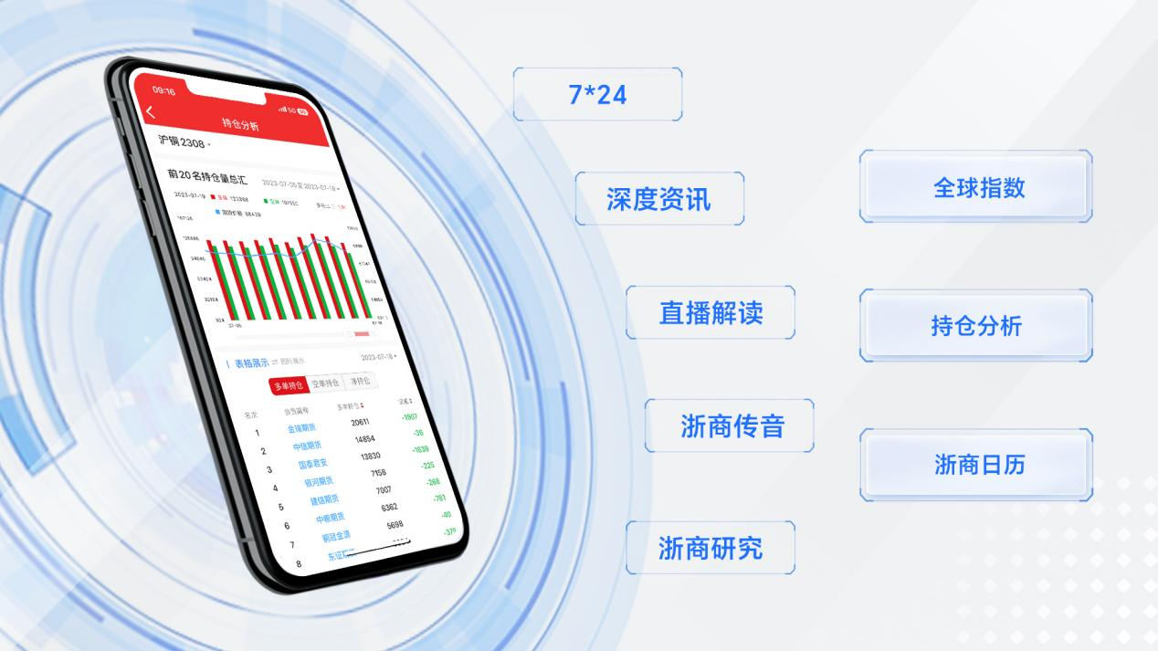 浙期汇App全新改版了全球指数、持仓分析、浙商日历等数据模块。其中持仓分析集中展示了各合约多空持仓量、以及多维度自由扩展汇总的建仓过程、持仓品种及相关性,还可任意叠加不同期货公司的汇总持仓数据,便于用户跟踪合约活跃度和趋势。通过这些可视化图表和信息解读,用户可以直观了解数据背后的含义。同时依托浙商期货研究所强大的研究能力和行业友商的深度合作,为用户提供7*24、深度资讯、浙商研究、直播解读、浙商传音等最新的市场动态和事件,从而让用户更敏锐地把握市场走势和交易机会。 智能化的分析决策
