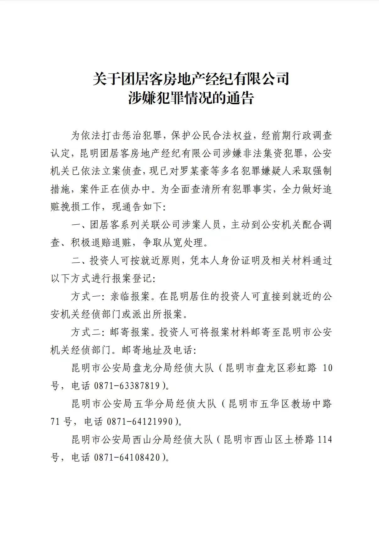 在昆明警方对团居客立案侦查的一个多月前,李莉突然接到派出所的电话,“派出所问我有没有参与非法集资”,她这才知道自己投资的理财产品出了问题。 李莉随即联系了团居客的客户经理,被告知本息可以兑换成车位和房产,公司也通知会在8月兑付一批现金,此时,她以为事情仍有回旋的余地。“不过,没有等到8月,客户经理就把警方的通告发给我,让我报警”。 7月14日,昆明市公安局盘龙分局发布通告称,经前期行政调查认定,昆明团居客房地产经纪有限公司(下称“团居客”)涉嫌非法集资犯罪,公安机关已依法立案侦查,现已对罗某豪等多名犯罪嫌疑人采取强制措施,目前,昆明市公安局多个分局和安宁市公安局正在接受投资人报案登记。 ![]() 图片来源:盘龙警方公众号 团居客成立于2019年12月,按照最初的定位,它应是一个类似于链家的房产经纪平台,做一二手房买卖和房屋租赁业务,拥有网站、app和小程序,也布局线下门店。根据乐居新媒体在2022年7月的报道,当时团居客已于昆明开设了30多家门店。 但显然,团居客似乎并不满足于做传统的房产中介。多位受访者告诉时代财经,其本人或亲属此前通过团居客以认筹楼盘的形式购买了理财产品,按照约定,到期后如果没有选择购买房子,则可以获得丰厚的利息,而团居客提供给投资人认筹的楼盘涉及多家房企,包括万达、俊发、远腾和星策等。 去年7月,李莉投入10万元认筹了位于昆明盘龙区的春城名筑1栋,期限为一年,被承诺到期后一次性还本付息,年化回报率高达15.6%。她原本以为可以拿到1.56万元的现金回报,但一分钱未曾到手,理财产品就爆雷了。 由于事发之前理财产品尚未到期,如果不是派出所的这通电话,李莉还未察觉到团居客存在问题。不过,早在今年2月,就有多名投资人在网络平台声讨团居客,他们称认筹资金到期后,团居客以公司遇到困难为由拒绝兑付,在购买理财产品时签署的认筹合同也不被楼盘开发商所承认。 至于“团居客案”波及的人数及金额目前并无具体数字。时代财经致电昆明市公安局某分局,一名工作人员也表示目前正在向投资人收取报案材料,“这个数额我们也不清楚,公安机关没有通报过”。 以卖房之名行理财之实 在今年2月中旬,王华发现此前通过团居客认筹的安宁万达中央公园5/10/15栋(下称“万达项目”)到期无法兑付,她庆幸自己没有投入太多资金,“之前家里有人因为‘小微金融’跑路,钱要不回来,所以我一直很谨慎,买得不多”。 王华提供的材料显示,她分别在春城名筑1栋和安宁万达中央公园5/10/15栋两个楼盘认筹了1万元。 “认筹”常见于楼盘营销中,指的是在楼盘取得预售证之前,购房者向开发商预先缴纳购房意向金,由此可以在楼盘正式开售时,优先于未缴纳意向金的购房者获得选房资格和价格优惠,而开发商亦可借此提前锁定购房群体范围,提高去化率。 不过,在王华和众多投资人看来,团居客的认筹实际上是购买理财产品。 王华和李莉均向时代财经提供了团居客app上“我的认筹”界面的截图,这里显示了投资人通过团居客购买的理财产品、投资期限、投资金额和回报金额,但与常见的理财产品不同的是,团居客没有金融术语,代之以楼盘名称、磋商期、认筹金额、优惠金额等词汇。 在王华看来,“‘我的认筹’界面显示的楼盘就是我买的(理财)项目,‘磋商结束’就是我买的项目到期了”,而‘优惠金额’就是她可以获得的投资回报。“”我的认筹“界面显示,王华在万达项目认筹了1万元,磋商期为2022年4月23日至2023年2月16日,预计获得优惠金额达到3008.30元,以此计算,年化收益率甚至超过30%。李莉对团居客的认知和王华基本一致,她表示,”客户经理一直说的是投资理财。 “我就2万元的资金,没考虑过在磋商期结束后把钱换成房产”,而根据王华与团居客签订的“团购商品房认筹协议”,她也有权利不这么做。 协议约定,王华可在磋商期内签署《商品房买卖合同》。不过,王华称团居客并没有对投资人购房资格进行审核,而昆明的主城五区和三个国家级开发(度假)园区实施限购政策。未能在磋商期内签署合同的,则不构成甲乙各方或其中任意一方的违约,甲方(指团居客关联方)、乙方(指投资人)和开发商均无需承担任何责任,而磋商期届满之日起7天内,甲方应向乙方无条件退还认筹金的同时支付补偿金。 时代财经了解到,投资人每认筹一个楼盘,就会签署一份认筹协议,协议由三方共同签署。一名投资人的家属黄燕告诉时代财经,家中老人一共在团居客投入了40万元,前后签署了4份协议,涉及4个楼盘。 综合多位受访者提供的信息,投资人目前成功认筹的楼盘至少包括安宁万达中央公园5/10/15栋、春城名筑1栋和翠湖一品。而在网络平台声讨团居客的投资人还提及俊发观云海云中苑9栋。 另有投资人在网络平台公布了此前团居客app上可供认筹的其他楼盘,包括雅居乐滇池一英里4/5/7栋、保利明玥半山1/2/4栋、俊发观云海千云荟3/4栋。不过,目前团居客app的“团购”页面显示“暂无房源”和“系统异常”,新房、二手房和租房页面虽正常显示,但置业顾问的电话却在拨通后无人应答。 开发商纷纷澄清:与我无关 团居客的爆雷不是没有征兆。今年2月,越来越多的投资人发现认筹资金到期无法兑付,一名投资人于2月15日在领导留言板网站发起求助称,“经过与开发商核实,开发商不承