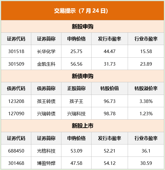 沪深股市:7月21日,沪指微跌0.06%,报3167.75点,深成指跌0.06%,报10810.18点,创业板指涨0.35%,报2163.12点。房地产、食品饮料、酿酒行业涨幅居前,电源设备、能源金属行业跌幅居前。 沪深港通:7月21日,北向资金大幅净买入58.25亿元。贵州茅台、长江电力、五粮液分别获净买入21.47亿元、1.53亿元、1.33亿元。隆基绿能净卖出额居首,金额为4.32亿元。 龙虎榜:7月21日,日内上榜龙虎榜个股中,资金净流入最多的是金桥信息,为1.01亿元。机构参与龙虎榜中个股共涉及25股,其中5股被机构净买入,荣盛发展被买入最多,为3976.97万元。另外20股被机构净卖出,人民网被卖出最多,为8159.1万元。 融资融券:截至7月20日,上交所融资余额报7773.42亿元,较前一交易日减少21.18亿元;深交所融资余额报7132.33亿元,较前一交易日减少29.64亿元;两市合计14905.75亿元,较前一交易日减少50.82亿元。 新股申购:本周,共有7只新股申购,其中创业板5只,科创板1只,沪市主板1只,分别为长华化学、金凯生科、民爆光电、盟固利、蓝箭电子、华虹公司、华勤技术。 限售解禁:本周,共有93只限售股解禁,实际解禁数量共计33.55亿股,解禁市值达到862.17亿元。其中,华大九天以186.67亿元排名解禁榜第一,奇安信和国博电子分别以106.47亿元、99.51亿元排名第二和第三。 北京商报:近期A股连续大涨的个股多数为亏损的绩差股,相比之下绩优股则横盘或者下跌,投资者不知所措,这样的走势应该被管理层关注并加以监督,不能让劣质股驱逐优质股的现象长期存在。对于监管层来说,资金炒作哪些股票无需干涉,但需要关注里面有没有操纵股价的行为。 沪深交易所:联合发布《以上市公司质量为导向的保荐机构执业质量评价实施办法(试行)》,并自发布之日起施行。对重大违法违规行为“一票否决”。根据保荐机构评价得分高低,将保荐机构划分为A、B、C三类。 上交所:将于2023年8月7日正式发布上证科创板100指数,该指数从上交所科创板中选取市值中等且流动性较好的100只证券作为样本,将与上证科创板50成份指数共同构成上证科创板规模指数系列,反映科创板市场不同市值规模上市公司证券的整体表现。 券商中国:今年上半年实现75.07%收益的半年度主动权益类基金冠军——诺德新生活混合披露了2023年二季报。值得注意的是,该基金在二季度将前十大重仓股换了个遍,基金经理周建胜表示,基于前瞻判断,从“信创+”切换到“AI+”。 每日经济新闻:基金二季报持续披露,更多明星基金经理的持仓浮出水面。富国基金朱少醒管理的富国天惠,二季度前十大重仓股更换了三只,兴齐眼药、春风动力和国瓷材料新进到前十大。而傅鹏博团队管理的睿远成长价值,前十大重仓股虽然仅更换了一只,但是有多只个股进行了减持,同时前二十大重仓股的后十位,有比较大的调整,主要增加了光伏和通讯类个股,港股主要增加了互联网标的。 财联社:7月21日盘后,知名媒体人胡锡进发布最新炒股心得。胡锡进表示,个人账户在收盘前忽红忽绿,最后停在了盈利107元的红色上。他同时表示,坚持自己对于股市已经处在底部的大判断。