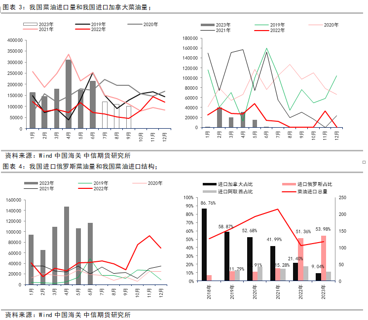 我国6月菜籽进口仍集中于加拿大和俄罗斯,且菜籽进口量呈现季节性下降,但仍同比增加680%。其中,进口加拿大菜籽占我国6月菜籽进口总量的98.28%。今年1—6月我国累计进口菜籽337万吨,同比增加428%;其中,累计进口加拿大菜籽318万吨,占我国菜籽进口总量的94.41%;累计进口俄罗斯菜籽15万吨,占我国菜籽进口总量的4.32%。