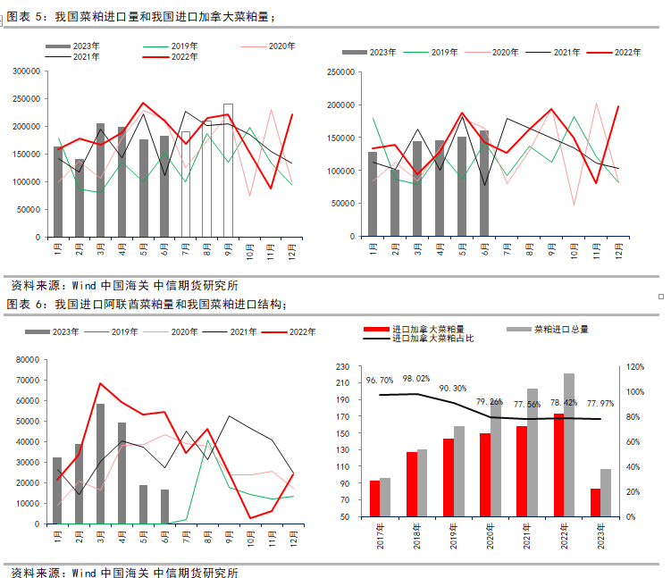 我国6月菜油进口来源地主要是俄罗斯、白俄罗斯、阿联酋和加拿大,且菜油进口量仍然较高,但进口加拿大菜油量明显下降。其中,进口俄罗斯菜油占比近55%,进口白俄罗斯菜油占比21.82%,进口加拿大菜油占比仅0.05%。今年1—6月我国累计进口菜油118万吨,同比增加115%。其中,累计进口加拿大菜油占比9.04%;累计进口俄罗斯菜油占比近54%;累计进口阿联酋菜油占比11.03%;累计进口白俄罗斯菜油占比12.34%。