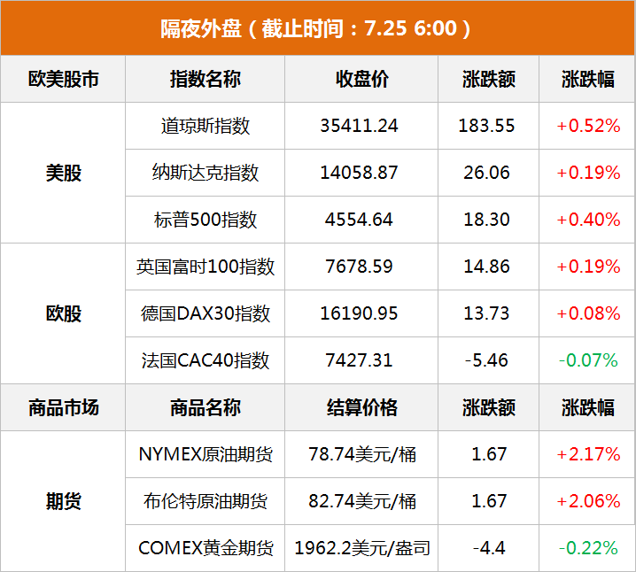 美股:标普500指数收涨18.30点,涨幅0.40%,报4554.64点。道指收涨183.55点,涨幅0.52%,报35411.24点。纳指收涨26.06点,涨幅0.19%,报14058.87点。 欧股:德国DAX 30指数收涨0.08%,报16190.95点。法国CAC 40指数收跌0.07%,报7427.31点。英国富时100指数收涨0.19%,报7678.59点。 亚太股市:7月24日,香港恒生指数收跌2.13%,报18668.15点;恒生科技指数收跌2.18%,报4015.08点。日经225指数收涨1.17%,报32692.50点。韩国KOSPI指数收涨0.71%,报2628.39点。 人民币:在岸人民币兑美元(CNY)北京时间03:00收报7.1860元,较上周五夜盘收盘涨22点。成交量375.80亿美元。 黄金:COMEX 8月黄金期货收跌0.22%,报1962.20美元/盎司。 原油:WTI 9月原油期货收涨1.67美元,涨幅2.17%,报78.74美元/桶。布伦特9月原油期货收涨1.67美元,涨幅2.06%,报82.74美元/桶。 新京报:贝恩公司发布2023年全球私募股权市场年中更新显示,全球资本市场上的“干火药”(即待投资金)再创纪录,3.7万亿美元蓄势待发。同时有2.8万亿美元的未退出资产即将进入退出窗口期,创下历史新高,是全球金融危机期间的四倍多。2023年上半年,全球并购基金的交易规模达到了2020亿美元,同比下跌58%;年化来看,交易金额比2022年下降了41%。今年上半年共达成863笔交易,年化交易量比2022年下降29%。