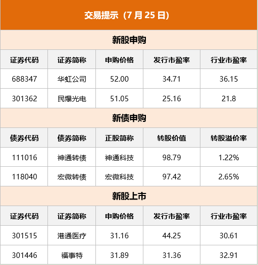 沪深股市:7月24日,沪指跌0.11%,报3164.16点,深成指跌0.58%,报10747.79点,创业板指跌0.75%,报2146.93点。船舶制造、工程咨询、生物制品、中药板块涨幅居前,能源金属、化肥、电池、农业板块跌幅居前。 沪深港通:7月24日,北向资金净卖出51.43亿元。比亚迪、宁德时代、山西汾酒分别遭净卖出3.65亿元、2.72亿元、2.69亿元;科大讯飞逆势获净买入3.27亿元。 龙虎榜:7月24日,日内上榜龙虎榜个股中,资金净流入最多的是焦点科技,为1.87亿元。机构参与龙虎榜中个股共涉及28股,其中13股被机构净买入,赛维时代被买入最多,为1.31亿元。另外15股被机构净卖出,荣盛发展被卖出最多,为7737.38万元。 融资融券:截至7月21日,上交所融资余额报7753.61亿元,较前一交易日减少19.81亿元;深交所融资余额报7100.09亿元,较前一交易日减少32.24亿元;两市合计14853.70亿元,较前一交易日减少52.05亿元。 上海证券报:近期,深圳证监局发布了《深圳证监局关于传达公募基金行业费率改革工作相关要求的通知》,该《通知》表示,被动股票型基金产品不得通过证券交易佣金支付研究咨询服务等费用,且交易佣金不得超过市场平均佣金费率水平;其他类型基金产品可通过证券交易佣金支付一定比例的研究咨询服务等费用,但交易佣金费率不得超过市场平均佣金费率水平的两倍。相关改革措施涉及规则修订,将于2023年底前完成。 证券时报:港股华虹半导体回A股上市,其市占率仅次于中芯国际,募资总额在科创板也是名列前茅。2020至2022年,公司营收仅次于中芯国际,其间二者复合增速分别为57.85%、143.97%,其中归母净利润复合增速领先。此次科创板IPO也意味着,华虹半导体将开启H+A双资本平台运作模式。 中国证券报:截至7月24日上午10:00,申万二级光伏设备行业已有21家光伏上市公司发布上半年业绩预告,披露进度已达三成。21家公司中,除2家预减外,预喜公司家数达到19家(扭亏2家,预增17家),预喜比例高达90%。其中,12家光伏企业预计净利润增长翻倍,展示出强劲的成长性。 中国证券报:日前,多家外资巨头旗下海外中国基金出手,瞄准新能源、互联网板块股票大手笔加仓,宁德时代、百度、腾讯控股等备受青睐。基金人士指出,展望下半年,在更加积极的政策支持下,中国经济环比增长预期增强,绿色投资相关机会值得关注。 券商中国:随着基金半年报披露完毕,二季度资金对基金品种的偏好也浮出水面。上半年,除了货币市场型基金外,对资金较有吸引力的是医药、半导体芯片等具有科创属性的ETF产品,头部基金单季度内的份额增长过百亿。业内人士认为,资金对医药板块的青睐来源于板块长期低估值的吸引力和对景气度反转的期望;而对于半导体芯片板块,资金的偏爱则来源于人工智能技术的催化以及行业的周期规律。 中证报:二季度末,公募基金总规模达到27.69万亿元,较一季度末增长超1万亿元。其中,股票型、债券型和货币基金实现规模较大幅度增长,混合型基金有所缩水。二季度公募基金总体获净申购超1.3万亿份。股混基金中,指数型基金是净申购主力军,二季度净申购份额位居前20的偏股基金中,有19只均为指数型基金。 国联证券:仓位方面,权益类基金股票仓位较上季度有所下降,其中普通股票型基金仓位下降 0.7%,偏股混合型基金下降1%,灵活配置型基金仓位下降0.5%,平衡型基金仓位上升1.0%;行业配置方面,与一季度相比,公募基金二季度加仓通信、电子、家用电器、汽车、医药生物。主动减仓的行业是食品饮料、交通运输、电气设备;配置集中度方面,前3大行业集中度明显下降,前3大行业占比由一季度的41.5%下降到 38.4%,前5大行业由一季度的57.4%下降到54.7%。 国盛证券:历史视角下,通信行业配置突破历史峰值,尤其是通信设备领域。综合行业仓位及行业超配比例观测,当前基金的行业配置分化依旧显著,一方面通信仓位与超配幅度均在二季度刷新历史峰值,同时军工、电力设备的配置仓位与超配幅度也处于历史高位;另一方面非银金融与商贸零售的仓位在二季度创下新低,超配幅度也降至历史底部。此外,结合单一维度看的历史经验看,基础化工超配幅度也降至历史低位,房地产开发仓位也降至历史底部。 平安证券:截至二季度末,主动权益基金港股仓位中位数9.12%,较上季末减少1.39%。以最近4个季末平均港股仓位超过60%的主动权益基金作为港股主题基金样本,港股仓位中枢于2023年二季末达到 81.1%,较上季末减少 3.14%。股票型基金的港股配置意愿出现变化,各类基金对港股的配置意愿已显现一定分歧。