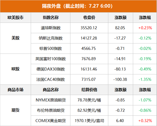 美股:标普500指数收跌0.71点,跌幅0.02%,报4566.75点。道指收涨82.05点,涨幅0.23%,报35520.12点。纳指收跌17.27点,跌幅0.12%,报14127.28点。 欧股:德国DAX 30指数收跌0.49%,报16131.46点。法国CAC 40指数收跌1.35%,报7315.07点。英国富时100指数收跌0.19%,报7676.89点。 亚太股市:7月26日,香港恒生指数收跌0.36%,报19365.14点;恒生科技指数收跌0.91%,报4218.83点。日经225指数收涨0.01%,报32652.50点。韩国KOSPI指数收跌1.63%,报2593.40点。 人民币:在岸人民币兑美元北京时间03:00收报7.1350,较上一交易日夜盘收盘涨37点。成交量387.34亿美元。 黄金:COMEX 8月黄金期货收涨0.32%,报1970.10美元/盎司。 原油:WTI 9月原油期货收跌0.85美元,跌幅1.07%,报78.78美元/桶。布伦特9月原油期货收跌0.72美元,跌幅0.86%,报82.92美元/桶。 海外网:最近的一份报告显示,一季度美国信用卡债务增长速度为二十年来最快。专家认为,高通胀已迫使许多美国家庭刷卡举债度日。