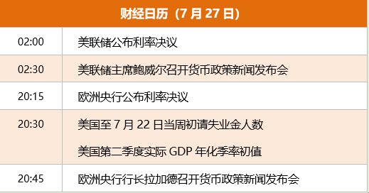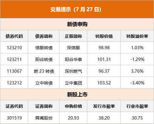 沪深股市:7月26日,沪指跌0.26%,报3223.03点,深成指跌0.47%,报10968.98点,创业板指跌0.08%,报2191.17点。房地产服务、工程咨询、房地产开发等地产链走强,游戏、传媒、计算机、互联网等TMT赛道跌幅居前。 沪深港通:7月26日,北向资金净买入5.15亿元。贵州茅台、宁德时代、中信证券分别获净买入6.38亿元、6.07亿元、4.61亿元。立讯精密净卖出额居首,金额为2.82亿元。 龙虎榜:7月26日,日内上榜龙虎榜个股中,资金净流入最多的是拓维信息,为1.04亿元。机构参与龙虎榜中个券共涉及21只(1只可转债),其中6只个券(1只可转债)被机构净买入,拓维信息被买入最多,为5466.08万元。另外15股被机构净卖出,四川黄金被卖出最多,为4872.51万元。 融资融券:截至7月25日,上交所融资余额报7734.96亿元,较前一交易日减少6.79亿元;深交所融资余额报7113.99亿元,较前一交易日增加2.72亿元;两市合计14848.95亿元,较前一交易日减少4.07亿元。 证券时报:当前市场底部特征明显,此次政治局会议可谓是一场政策“及时雨”,有利于强化市场信心,吸引增量资金流入,提振国内消费,推动市场企稳回升。建议把握底部布局机会,逢低加仓。 证券日报:7月份以来,A股市场出现震荡上涨,期间机构也积极调研,寻找优质资产。数据显示,7月份以来,截至7月26日,有543家上市公司获机构调研。从申万一级行业来看,上述543家公司主要集中在机械设备、电子、电力设备、医药生物、计算机等五大行业,分别有71家、52家、50家、49家、49家。 中经网:目前已有35家家电上市公司发布2023年上半年业绩预告。受益于消费复苏、夏季高温天气以及电商大促,长虹美菱、海信家电等一批白电公司业绩尤为亮眼。其中,不少智能、绿色的家电新品,成为相关公司业绩增长的利器。黑电及小家电板块整体处于复苏态势。 上证报:近期,房地产、建材、证券、中概互联网等超30只相关ETF涨幅在5%以上。首批3只中证国新央企现代能源ETF均达到募集规模上限20亿元,并启动比例配售。部分知名基金经理旗下基金亦“开门迎客”,恢复大额申购。多家基金公司表示,在此背景下,权益资产的配置价值逐步显现。 中证报:基金二季报披露完毕,外资公募产品投资情况随之浮出水面。贝莱德中国新视野二季度杀入人工智能板块。富达基金首只产品富达传承6个月股票仍处于建仓期。外资公募人士表示,消费、建材、家电等板块风险收益比具备吸引力,AI引领的TMT领域长期来看有望成为市场主线。