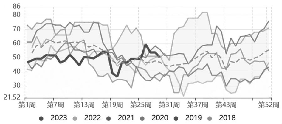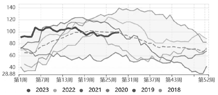 图为PTA-乙二醇2309合约价差(单位:元/吨) 成本方面,Brent原油近期较为强势,但加息预期下存在下行风险,且FOMC会议可能会推动美元升值,给原油价格带来压力。石脑油-原油价差受到大幅压缩,而美国汽油目前库存绝对值回归低水平,调油利润较高,PX价格保持坚挺,PXN保持在440美元/吨的高位,PTA加工费在200元/吨左右。在较为强劲或者说稳定的成本支撑下,PTA的估值短期提升的可能性较大。 PTA:面临回调风险 PTA无论是开工率、产量都在下降,主要是由于近期新材料提负、福化重启、恒力惠州投产、四川能投因故停车,已减停装置延续检修。截至7月24日,独山能源停车、福海创负荷降至五成,PTA开工率跌至79.51%,上周产量123.17万吨,小幅回升。整体来看,PTA现货流通还是偏紧的,对于价格支撑起到了一定作用。未来三、四季度PTA将有桐昆2期、宁波台化、仪征化纤3#投产,届时将产生不小的供应压力。 截至7月25日,国内聚酯产能在7701万吨/年,产能利用率为91.15%,仍然处于较高水平。但近期聚酯产销一般,长丝、切片、瓶片等利润稍有下滑。织造业开工率在71%,比上周稍有下降,主要原因是终端织造订单冷清,企业开工积极性不高。6—8月原为聚酯产业链淡季,如今“淡季不淡”的景象在终端需求弱化与利润下行的情况下也难以长期维持。 乙二醇:底部存支撑 截至7月25日,乙二醇产能增至2589万吨/年,其中乙烯法制乙二醇产能在1724.1万吨/年,煤制乙二醇产能在925万吨/年。二季度前期国产货供应增加,供应明显过剩,加上下游修复不及预期,市场压力偏大;后期供需逻辑和宏观逻辑有所转换,供需矛盾不突出,市场重心持续下移。