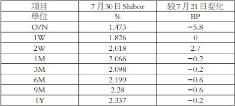 7月30日当周,国内市场利率整体呈现下降的态势。一方面,进入月底,资金需求已经释放,市场短期资金需求开始下降;另一方面,国内中长期资金需求下降,央行又在不断降低融资成本,中长期利率呈现弱势格局。截至7月30日,上海银行间同业拆放利率(Shibor)隔夜、1月期、3月期、6月期、9月期、1年期利率分别为1.473%、2.066%、2.098%、2.199%、2.28%、2.337%,较7月21日分别下降5.8、0.2、0.2、0.6、0.6、0.2个百分点。 为了平抑月底的资金需求,央行在上周累计开展了3410亿元的逆回购,上周到期逆回购量仅为1120亿元,单周累计向市场净投放流动性2290亿元,缓解了月底资金需求紧张的问题。进入8月,随着资金需求的下降,央行逆回购操作或恢复正常。7月份,央行有1000亿元的中期借贷便利(MLF)到期,央行续作1030亿元,超额续作30亿元,整体影响有限。8月份,央行有4000亿元的MLF到期,额度较大,需要关注后续央行的操作。