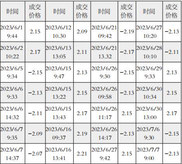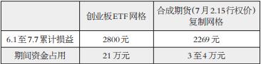 图为合成空头与创业板权重股对冲策略损益对比 合成“小股指多头”的网格策略 股指期货由于具有杠杆效果,在复制指数多头时,可以起到节约建仓资金且不影响损益的效果。国内场内交易所四个股指期货品种IH、IF、IC、IM,每手对应的名义价值较高,不适合喜好小单交易的投资者,标准的股指期货满足不了市场上ETF网格交易投资者,而且当前也没有场内双创类股指期货。但是可以通过创业板ETF期权或者科创50ETF期权合成多头来实现网格交易,双创类ETF基金波动率高于50ETF、300ETF与500ETF等现有期权标的,因此双创基金更能得到网格交易者的青睐。 以往直接采用买入ETF本身,需要动用较大本金,但如果采用双创类期权合成多头复制ETF基金,可以大幅节约建仓成本,而被节省出来的那部分资金可以去做固收类产品,这种模式既是网格交易策略,也带有浓厚的“固收+期权”模式,既可以节约网格交易成本,也能进一步通过固收增强总仓位收益。文章以0.02元作为创业板ETF的网格单位,即每上涨0.02元,卖出10000份创业板ETF;每下跌0.02元,买入10000份创业板ETF,在下表中成交价格2.15代表卖出成交价(不考虑交易滑点与手续费),成交价格-2.15代表买入时的成交价。投资者也可根据自身需求调整单次买入卖出的仓位量,本文案例中采用的基础仓位为10000份ETF或一个合成期货组合。 通过实盘数据回测,在6月1日至7月7日期间,采用ETF网格交易共获利2800元,若用创业板ETF期权合成期货复制网格,共获利2269元。产生复制效果偏差的原因:一方面,期权合成期货升水变化情况会影响复制效果;另一方面 ,在指数短促快速拉升或者下跌时,ETF本身往往能及时按网格价格成交,而期权合约价格变化幅度较大,容易出现短线的价格不合理偏离,也会影响到复制效果。 本文的案例中出现了一定幅度的负面影响,致使合成期货的网格交易收益小于ETF本身的交易,但是合成期货的网格交易最大优点是极大程度节约了资金占用成本。本文案例中,采用ETF交易需要动用大约10万份创业板ETF,资金21万多元,复制为合成期货需要10个组合,权利金与保证金占用在3万到4万多元。从资金占用与收益率角度来看,通过合成期货实现网格交易,收益率高。