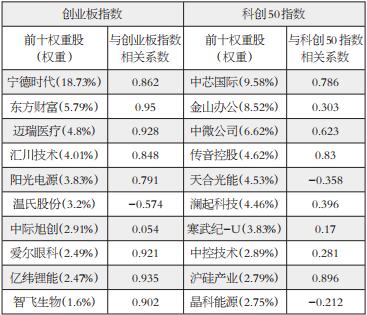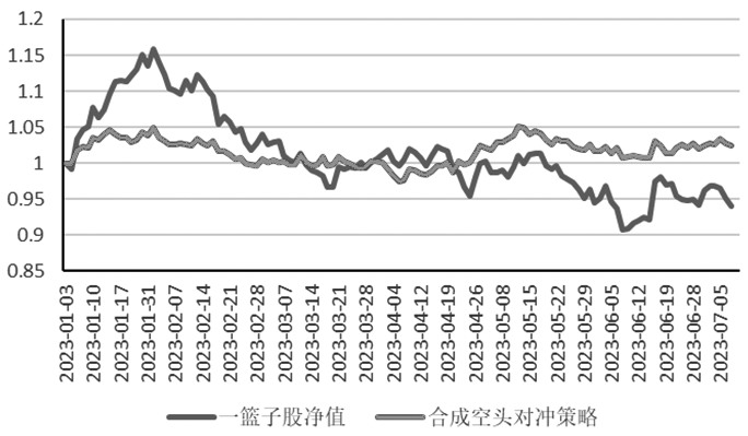 图为科创50ETF期权合成期货套利空间(12月合约) [期权合成“小股指期货”实盘策略研究] 目前四个场内股指期货品种为IH、IF、IC、IM,分别对应上证50、沪深300、中证500、中证1000指数。从品种覆盖面来看,缺乏双创类的股指期货品种。当投资者持有创业板、科创板相关的指数基金或者关联性较大的个股,缺乏相应的股指期货工具配合应用。因此,在创业板ETF期权与科创50ETF期权推出后,可用期权工具合成股指期货的方法,合成创业板ETF、科创50ETF类别的“小股指期货”,满足在实盘操作中的工具需要。经过前文对于这两个品种的期权平价验证,二者并未出现较大的套利空间,合成期货的效果正常。 在实盘中,合成期货可以对冲相关个股大跌风险,也可以复制指数多头,节约多仓建仓资金占用,比如在常用的网格交易中,每个ETF期权合成期货多头组合对应10000份ETF现货,以网格交易的方式逐步降低成本。 创业板、科创类个股对冲策略 创业板指数与科创50指数前10大权重股占比共计在40%以上,集中度较高。创业板指数前10大权重股当中与指数相关系数在0.8以上的个股有7个,相关性普遍较高。科创50指数前10大权重股中仅有2只股票的相关系数在0.8以上,科创50指数权重股与指数相关系数不足,个股之间分化严重。因此,本文采用创业板权重股与期权合成空头之间的组合策略作为实证案例。选取创业板前10大权重股中与指数相关系数0.8以上的股票加入篮子(共7只个股选入篮子)。如果这几只个股采用市值平均分配,会降低一篮子股与创业板指数的相关性。所以,文章以每只个股在创业板指数中的权重来分配市值。实证研究以400万元为初始资金,按照2023年1月3日创业板ETF收盘价折算,大约需要175个合成创业板ETF期权的空头组合。 从实证结果来看,自年初以来,合成空头对冲策略累计收益优于裸持篮子股票,也反映了近半年多以来,该篮子股票跑赢了创业板指数与创业板ETF,获得了超额的alpha收益。不做对冲的一篮子股票净值起伏较大,累计损益为-6%,最大净值回撤超过20%,稳定性不足;如果采用合成空头对冲,累计损益为2.5%,其间最大回撤略高于5%,跑赢指数近8.5个百分点,策略稳定性高。