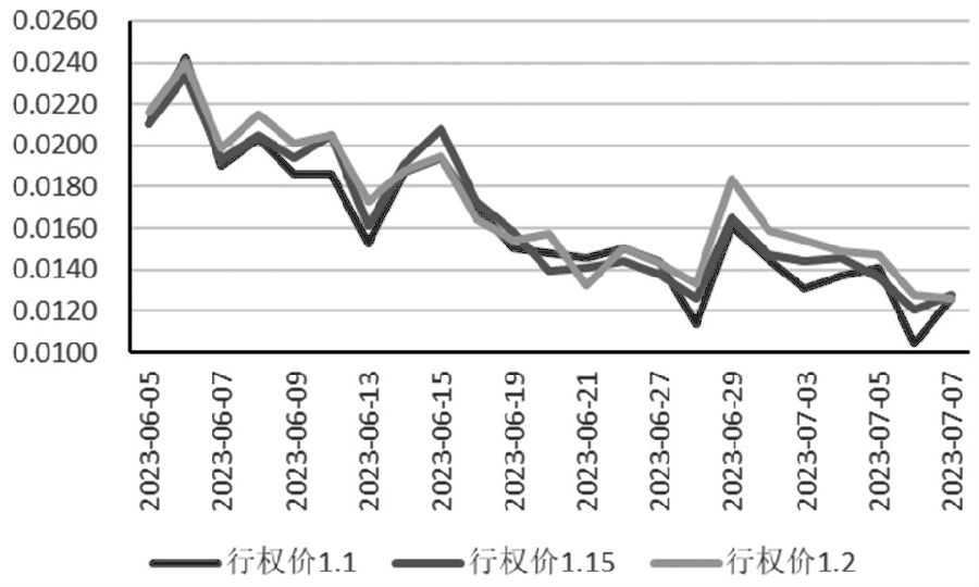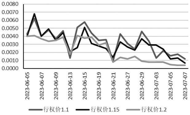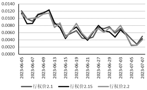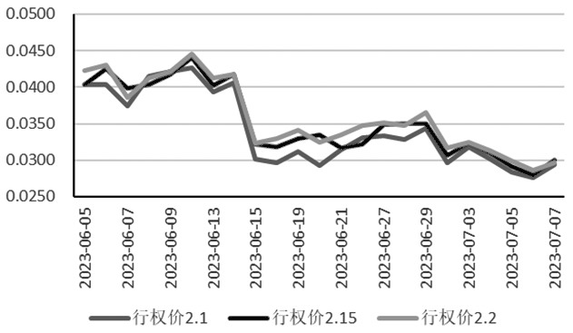 图为期权合成空头损益 [合成多空头套利空间验证] 文章选取了创业板ETF期权与科创50ETF期权作为样本数据,以C+K-S-P计算期权合成期货的套利空间,计算结果不考虑利率贴现的影响,分别用7月与12月的三档行权价计算套利空间。组合普遍处于小幅度多头升水状态,即合成多头相对于ETF本身具有小幅度的溢价。采用创业板ETF期权7月合约合成多空头,近一个月从0.01附近(对应每个组合100元)回落至0.006附近,每个合成多头组合对应10000份创业板ETF。截至7月初,7月合约构建的创业板ETF期货升水率0.28%;同样,当前7月的科创50ETF期权合成的期货升水率处在0.2%上下。 对于12月合约合成的多空头,当前创业板ETF期权合成的期货升水略高于0.03,升水率1.4%。由于12月合约距离到期还有近半年,因此,合成创业板ETF期货的年化升水率为2.8%左右。需要注意的是,前文用期权平价公式验证套利空间时,未考虑利率贴现的影响,若考虑到利率(可以参照一年期shibor,当前利率为2.36%)的影响,创业板ETF期权与科创50ETF期权合成的期货组合的无风险套利空间很小。因此,这两个品种的市场定价比较合理,未出现较大偏差。