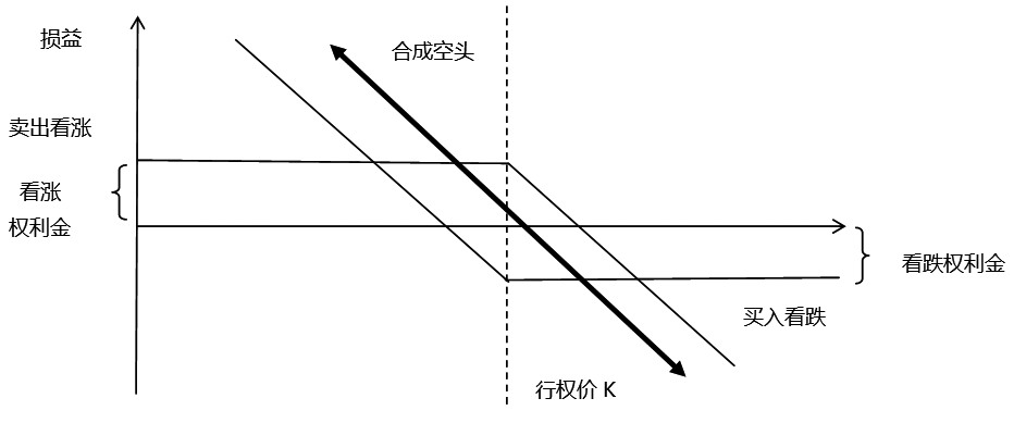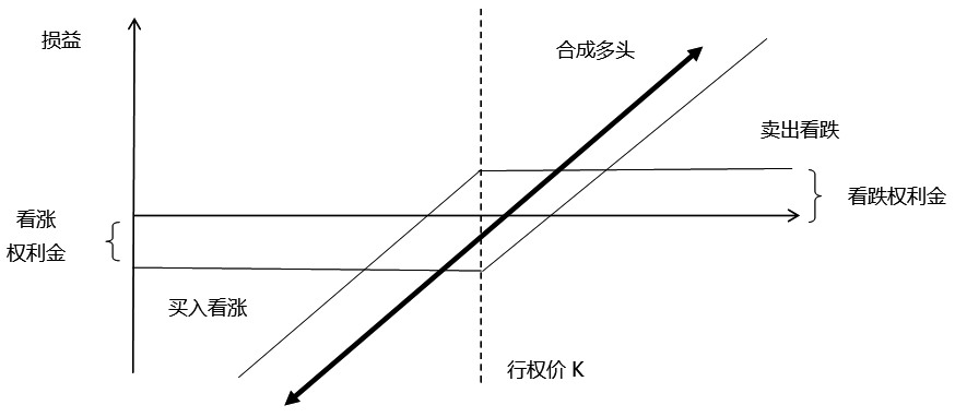 [期权合成期货多空头原理] 随着创业板ETF期权、科创50ETF期权、科创板50ETF期权的陆续推出,填补了国内场内交易所在双创类指数衍生工具方面的空缺,但双创类股指期货尚处于空缺状态。本文采用期权合成期货多空头组合,从而复制双创类小股指期货工具。期权合约价格变化呈非线性特征,但在期权众多组合策略中,采用同一行权价认购与认沽合成的期货多空头基本表现出线性变化特征。根据国内目前场内股指期货合约细则,按目前的指数点位,除了IH股指期货之外,其他三个品种(IF、IC、IM)每一手对应的名义市值均在百万元以上,保证金也普遍需要10万元以上,单手较高的价值不太适合习惯交易小仓位的投资者。每个ETF期权合成多空头发挥的效果几乎等同于10000份ETF基金,名义市值仅几万元,非常适合交易小仓位的投资者。文章首先介绍期权合成期货多空头的原理,以及在期权平价套利公式下,期权合成多空头组合的定价合理性。 买入认购期权与卖出同一行权价认沽期权所构成的组合为合成标准多头;同理,买入认沽期权与卖出同一行权价认购期权构成合成标准空头。通常根据不同行权价(K1K2K3…Kn)合成的多空头之间损益表现差别不大,否则存在套利空间。比如在实盘行情中,以创业板ETF期权为例,买入认购8月2100+卖出认沽8月2100构成的合成多头,其盈亏效果几乎等同于买入认购8月2200+卖出认沽8月2200构成的合成多头。 对于合成多空头套利空间的衡量,可引用期权平价公式:C+Ke(-rT)=P+S。认购期权价格C与行权价K的现值之和等于认沽期权的价格P加上标的证券现价S,K乘以e的-rT次方就是K的现值。当公式左边大于右边,反映了认购期权价格C被高估;反之,则认沽期权价格被高估。