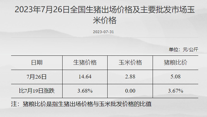 发改委:猪粮比价为5.08 比7月19日上升3.67% 发改委网站 07月31日 截至7月26日,全国生猪出场价格为14.64元/公斤,比7月19日上升3.68%;主要批发市场玉米价格为2.88元/公斤,与7月19日持平;猪粮比价为5.08,比7月19日上升3.67%。 (文章来源:发改委网站) (责任编辑:admin)