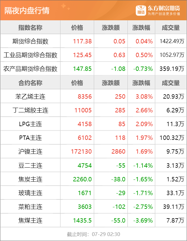 隔夜行情![]() ![]() 每日精选巨震!多国宣布暂停大米出口 全球大米价格徘徊在11年来高点附近 持续燃烧约三个月!加拿大野火冲击能源产业 石油天然气产量大降 粗钢“平控”消息再起!这些品种会受影响? 宏观产经财联社:记者联系广州市住房城乡建设局,从工作人员处了解,广州市住房城乡建设局正认真学习领会中央政治局会议精神,按照倪虹部长在有关座谈会上的讲话要求,在市委、市政府领导下,坚持稳中求进工作总基调,实事求是抓紧推进落实,将结合广州实际尽快推出有关政策措施,大力支持、更好满足刚性和改善性住房需求,促进广州房地产市场平稳健康发展。 新华社:在超大特大城市积极稳步推进城中村改造工作部署电视电话会议28日在京召开,中共中央政治局委员、国务院副总理何立峰出席会议并讲话。何立峰指出,积极稳步推进城中村改造有利于消除城市建设治理短板、改善城乡居民居住环境条件、扩大内需、优化房地产结构。 商务部:全国消费促进工作年中推进会召开,会议强调,促进消费持续恢复和扩大,对于巩固经济回升向好基础、推动高质量发展具有重要意义。各级商务主管部门要坚决贯彻落实党中央、国务院决策部署,把实施扩大内需战略同深化供给侧结构性改革有机结合起来,持续办好“消费提振年”系列活动,提振汽车、家居等大宗消费,推动服务消费提质扩容,改善消费条件,创新消费场景,更好发挥消费拉动经济增长的基础性作用。 品种资讯黑色系期货 螺纹钢:中国钢铁工业协会会长谭成旭29日在鞍山召开的中国钢铁工业协会六届六次理事(扩大)会议上表示,上半年,随着中国经济延续恢复态势,钢铁产量同比增长,保障了经济恢复发展的用钢需求。(财联社) 近期,市场再传粗钢“平控”消息,据Mysteel了解,云南省钢厂已陆续收到粗钢压产相关文件,通知要求:根据全省钢铁行业2023年粗钢产量调控目标任务和工作安排,对照2022年粗钢产量考核任务目标并结合钢铁企业生产经营实际,提报粗钢产量压减任务计划。(期货日报) 铁矿石:7月28日全国主港铁矿累计成交96.7万吨,环比下降17.3%;本周平均每日成交97.9万吨,环比下降10.3%;本月平均每日成交102.6万吨,环比上涨0.3%。 Mysteel统计全国45个港口进口铁矿库存为12451.96万吨,环比降88.60万吨;日均疏港量313.73万吨降0.12万吨。(Mysteel) 焦煤:中国钢铁工业协会7月28日发布数据,2023年6月,对标企业煤焦类采购成本环比延续下降趋势,国产铁精矿和生铁有所回升。2023年1-6月,炼焦煤采购成本同比下降17.66%;冶金焦同比下降25.07%。(界面新闻) 焦炭:7月28日当周焦企焦炭库存29.6万吨,环比减少4.8万吨,降幅14.0%。焦企焦煤库存343.8万吨,环比增加13.1万吨,增幅4.0%。钢厂焦炭库存255.3万吨,环比减少6.3万吨,降幅2.4%。(SMM) 农产品期货 大米:当地时间7月29日,俄罗斯政府通报,俄方已决定继续临时禁止本国大米及碎米出口,期限至今年12月31日,“以保障国内市场稳定”。无独有偶,阿联酋经济部也于28日宣布暂停阿联酋大米的出口和再出口。(上海证券报) 白糖:7月28日广西白糖现货成交价为7074元/吨,下跌11元/吨;产区制糖集团报价区间为6890~7380元/吨,加工糖厂报价区间为7170~7620元/吨,期价回落,糖企报价整体小幅下调10~20元/吨。现货交投谨慎,成交一般。(泛糖科技) 玉米:卓创资讯监测数据统计,截止到7月27日,全国玉米均价2799.21元/吨,较7月中旬(7月12日)高点价格下跌17.44元/吨,跌幅0.62%;较上月涨幅1.43%,同比去年涨幅2.45%。(新华财经) 棉花:中国储备棉管理有限公司定于7月31日通过全国棉花交易市场上市销售储备棉重量10002.705吨,共37捆。(中储棉信息中心) 红枣:产区交易不温不火,采购客商看货寻货现象不多,个别刚需客商挑拣合适货源少量补货,成交以质论价为主,走货速度缓慢。销区市场红枣走货氛围一般,客商挑拣合适货源采购,以质论价,购销随行。(中枣网) 有色/贵金属期货 碳酸锂:上海钢联7月28日发布的数据显示,国内电池级碳酸锂均价相比27日下跌0.35万元/吨至28.15万元/吨,国内氢氧化锂报价相比26日亦有所下跌。(上海证券报) 铜:截至7月28日,全国主流地区铜库存较7月24日减少0.98万吨至9.92万吨,且较7月21日减少1.67万吨,连续3周周度去库。但总库存较去年同期的7.06万吨仍高2.86万吨。(SMM) 铝:当地时间7月28日,五个欧洲行业协会在一份联合声明中表示,他们要求伦敦金属交易所(LME)不要去理会“禁止俄罗斯铝金属”的呼吁,因为此举会损害欧洲较小的金属消费用户。(财联社) 据中国有色金属工业协会7月28日消息,为进一步增强铝产业链供应链的韧性与安全,围绕绿色低碳发展,中国有色金属工业协会将协同铝产业链上下游企业,与上海期货交易所探索推出铝合金期货。(上海证券报) 工业硅:据中国有色金属工业协会硅业分会,7月28日当周国内工业硅现货价格保持稳定。其中,除云南地区化学级工业硅价较上周上涨200元/吨,主流价格在14500-15200元/吨以外,其他现货硅价保持平稳。(界面新闻) 能化期货 原油:加拿大境内的野火已经持续燃烧了约三个月。除了毁坏土地、房屋、基础设施外,野火还冲击了该国的能源行业。据了解,艾伯塔省是加拿大能源大省,持续的野火导致该省5月份的石油和天然气开采量下降了3.6%,这是自2020年4月以来的最大降幅。(央视财经) 据华尔街日报,俄罗斯石油公司签订了出售大部分石油产量的协议。(