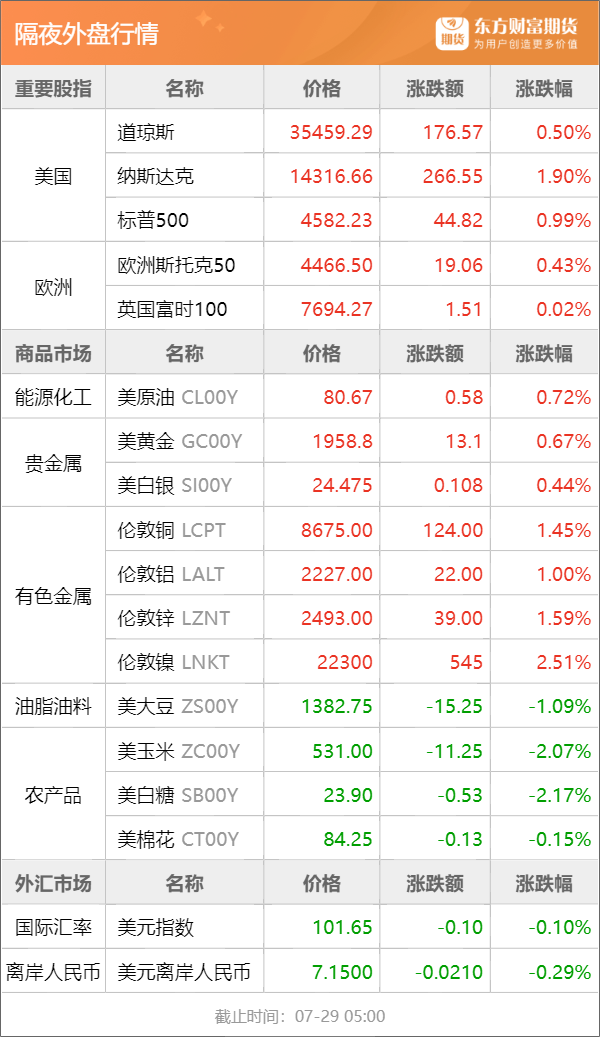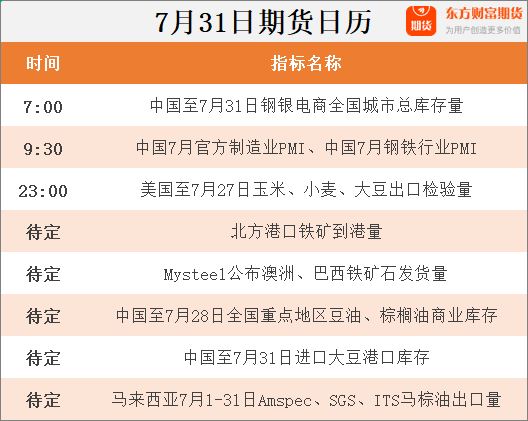 东方财富期货早餐 7月31日 周一