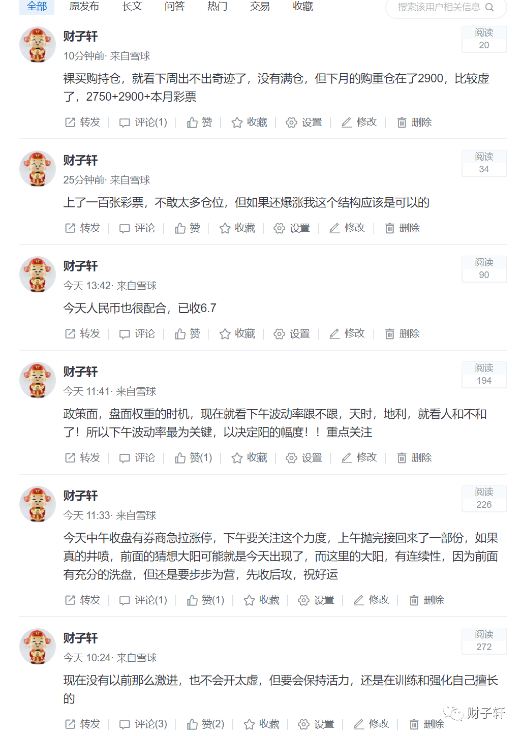 这一周的走法上一篇基本上说了,还是应了我的盘感!等到了这根大阳线!心理和实收上得到极大的满足! 而这里的阳线非常具有代表性,洗盘充分,天时(政策面非常好),地利(大盘所处的位置),人和(目前看还不够,气氛还没有起来,信心也还没有起来,从今天的下午波动率没有怎么起来及券商板块想打板又打不出气势可以看出来)。 前两天盘面表现的都是题材类小盘股,昨天有预感权重要起动,而今天的盘面恰好这么表现了,人民币升值给予今天走势极大的信心。 股票上一直的鼓励加仓的,没有什么好说的。 期权,今天我的操作整体是比较保守的,上午就抛到比较好的高点,先清空了一波,然后下来到还算比较接近今天低点又重新布局了标的合约,下午再冲上去又清了,今天交易成交量达到了接近3000张,来回折腾,也因为不够自信,但每次交易利润还行,本金不多的情况下,还是折腾出了不少利润。总的来说是采用的高抛低吸,先收后攻,收回利润,让利润再去做。下午风格转向下月更虚的,是看上了下午必有一波抬升,接近收盘时开始平调一些,从500张减到了200多张,然后加了一百张当月彩票2850,是可以归0的,很久没有玩彩票了,这种强势行情可以试,也是因为有利润才敢这样做,虽然钱不多,但也是钱。收盘后尽然都收到最高点。 下一周,周一开盘如没有大的利空惯性上冲是肯定会有的。这里的这根阳线树起了一个标志,有开拓性,所以下周还可以大胆想象,大胆做!而我对连续性阳K线是有期待的,持仓就很明显偏于此,自认为我的持仓还是比较灵活性的。攻守都不是很怕!如突破将是爆利!祝好运! 下面是雪求最近几天截图,当时一些想法,可观瞻,不可为之操作之用,更多为记录。