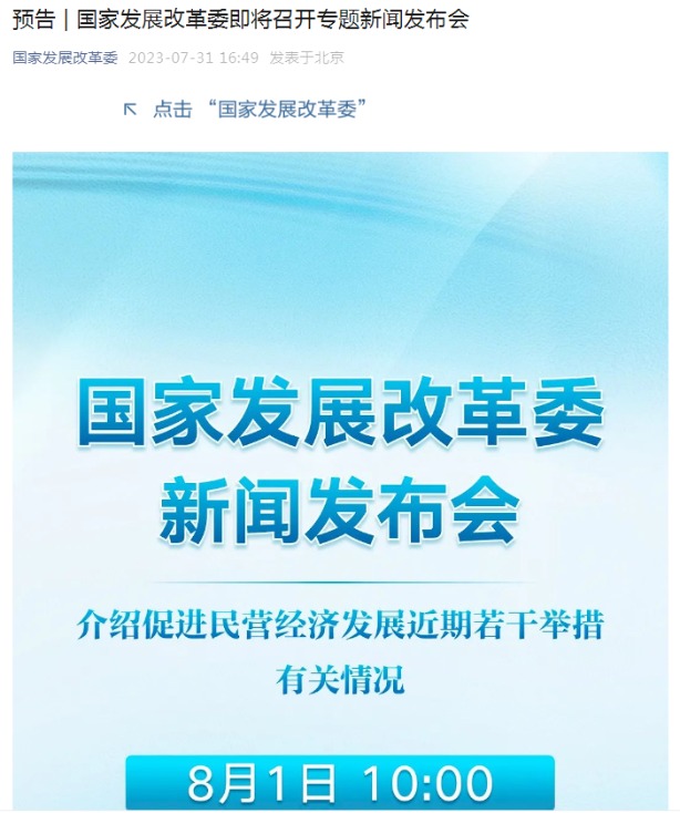 发改委明日召开发布会 介绍促进民营经济发展近期若干举措有关情况 每日经济新闻 07月31日 国家发展改革委将于8月1日上午10点召开专题新闻发布会,介绍促进民营经济发展近期若干举措有关情况。(文章来源:每日经济新闻) (责任编辑:admin)