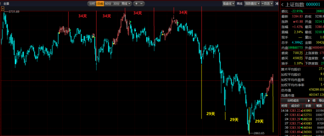 结果还真的搞出了个扩张三角型D浪上升来,这个扩张三角型ABCDE是极少见的呢,还真让我有生之年又看到了一次,不错不错。 我周五上午的时候就在想,有本事下午创新高突破3270.56点,但就是不突破3290.26点,且美股周五晚上再来个大跌,导致下周一低开低走就好玩了。 结果意念起效了,下午突破了3270.56点,最高打到3286.62点,仅差4点不到,就是没突破3290.26点。而且晚上道指大跌880点,纳指大跌3.52%,太有意思了,猜测周一大盘要大幅低开31点。 周五为何大幅低开24点后一路往上?最主要原因是周四是调整的,导致了5分钟超买变成了超卖,且15分钟在低位,大幅低开后,可以支持一路上扬。 而下周一为何大幅低开后反而大概率会低开低走?其中一个原因也是因为5分钟的严重超买,日线有超买迹象,120和60分钟有特别严重超买迹象,这种超买共振会导致弹簧压得过久后,有一种向下爆发的力量。 当然,最主要原因并非超买共振造成的,而是浪型时间寿命决定的。 动物有寿命,人也有寿命,浪型是人情绪的表现,自然也是有寿命的,体现在股市里呈现平均寿命的规律。 咱们就近看下股市高低点寿命规律是怎样的。