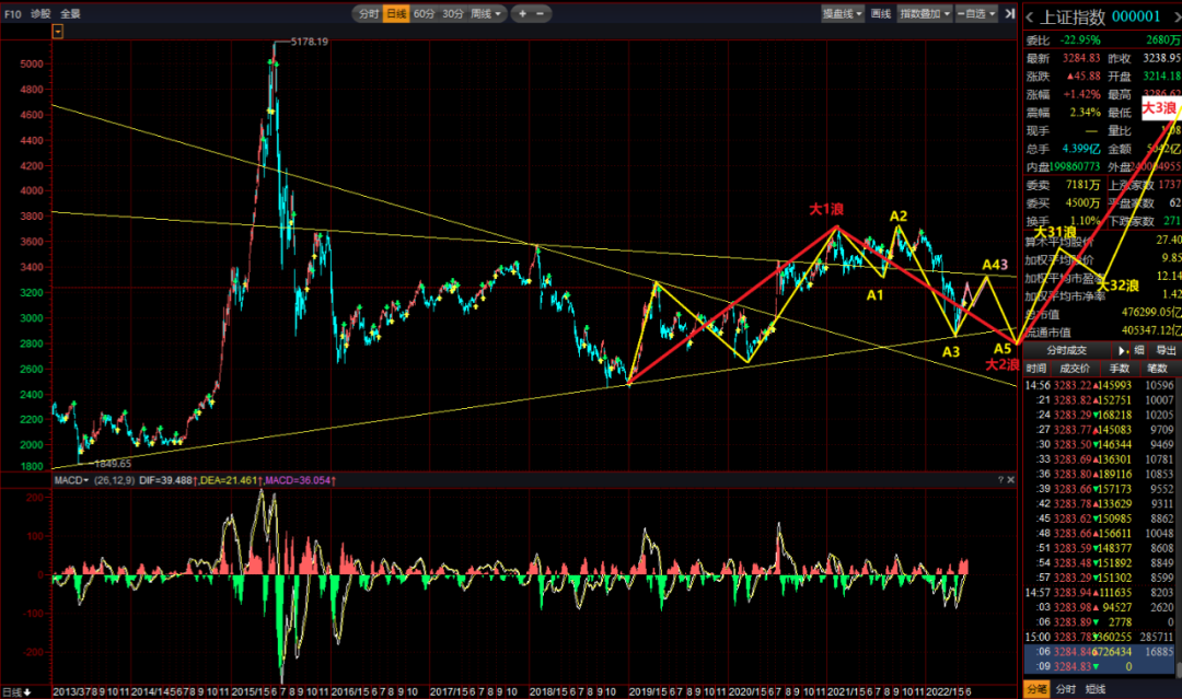 这个大A4浪上升结束后,后面应该就是大A5浪调整,必须破2863点的,不然就是不大A5浪调整了。这幅图样我是在今年元旦之前就划好的,至今没有任何改变,跟踪我半年以上的老朋友应该都记得。 尤其是大A33浪的5浪结构下跌趋势浪,完全符合我的预期。所以,如果后面真的有个大A5浪下跌破2863点,一旦补掉2855点最后缺口,我会央求你们全仓进场不要犹豫的,此后3年内,我不会再提示大盘风险了,将彻底看多,坚决不做“空狗” |