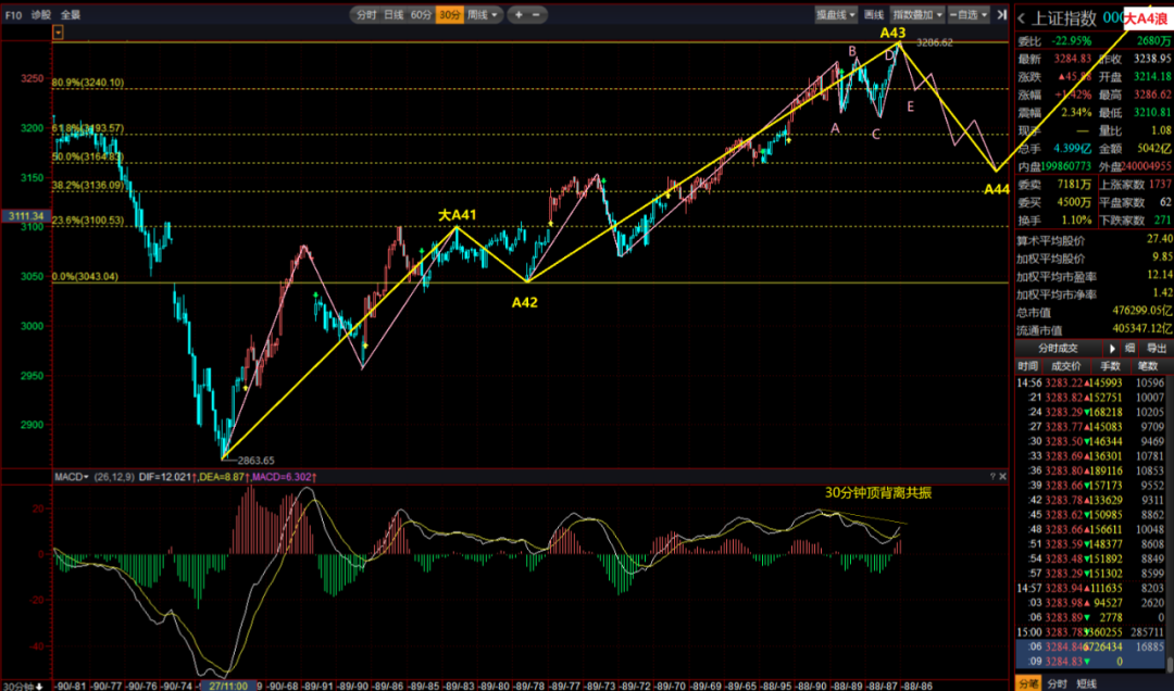 大家可以自己数一下,前面红字标注的是不是都是34天?间隔的也有24天的小规律。但近阶段黄字标注的都是29天。这是不是就是小寿命规律?也叫做健康周期。冥冥之中天注定。 更有意思的是,周五6大指数,甚至中证1000指数,全部出现了日线高9阳线序列,这是极少见到的,几年也难得碰到过一次哦。别看周五阳线挺猛的,如果我把它叫做回光返照,您同意么? 记得4月底5月初的时候我就反复说过,如果这波反弹是大A34浪上升的话,上升的时间应该在25-33个交易日,一般应该突破3290.26点的,除非反弹时间特别长可以例外。目前反弹时间是29个交易日了,在此域值内。 但我5月底6月初的时候又说了,我更愿意相信这是大A4浪上升,级别应该比大A34浪高一个档次。如果是大A4浪反弹,上升的时间应该比大A2浪上升时间要长。大A2浪反弹了34个交易日,所以大A4浪反弹时间应该会比大A2浪长得多,这也是我现在的预判。 按照大A4浪反弹划分的话,后面应该走一个大A42浪调整,这个调整低点绝对不允许跌破半分位3075点的,最好在0.618即3125点之上止跌,后面再走一个大A43浪末浪短浪上升为妥。 我划了一下图,认为这个大A42浪调整,其实也可以当成是5浪结构推动浪的大A44浪调整,后面再走一个简单的单浪结构大A45浪就结束了。试着先用30分钟周期划图如下: