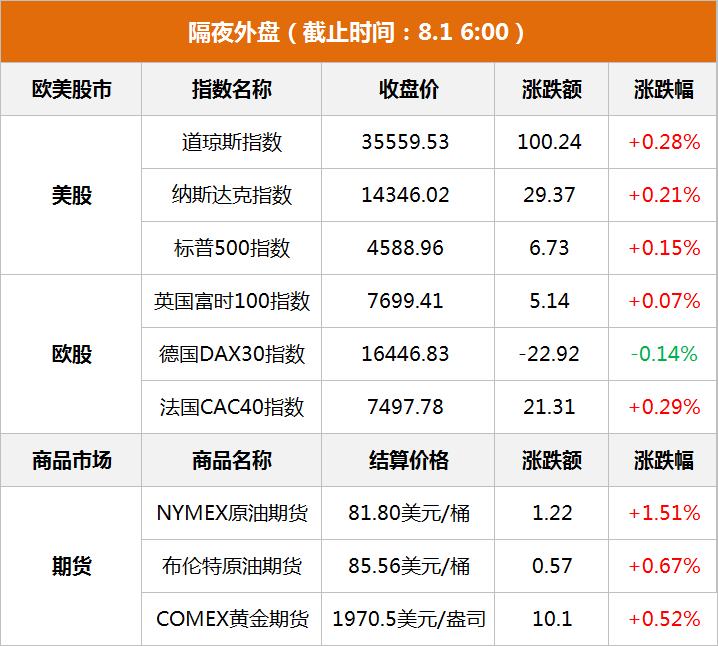 美股:标普500指数收涨6.73点,涨幅0.15%,报4588.96点。道指收涨100.24点,涨幅0.28%,报35559.53点,7月份累涨3.35%。纳指收涨29.37点,涨幅0.21%,报14346.02点,7月份累涨4.05%。 欧股:德国DAX 30指数收跌0.14%,报16446.83点,7月份累计上涨1.85%。法国CAC 40指数收涨0.29%,报7497.78点,7月份累涨1.32%。英国富时100指数收涨0.07%,报7699.41点。 亚太股市:7月31日,香港恒生指数收涨0.82%,报20078.94点;恒生科技指数收涨1.87%,报4549.95点。韩国KOSPI指数收涨0.93%,报2632.66点。日经225指数收涨1.34%,报33205.00点。 人民币:在岸人民币兑美元北京时间03:00收报7.1435,较上一交易日夜盘收盘涨62点。成交量427.63亿美元。 黄金:COMEX 8月黄金期货收涨0.51%,报1970.50美元/盎司。 原油:WTI 9月原油期货收涨1.22美元,涨幅1.51%,报81.80美元/桶。7月累计上涨15.80%。布伦特9月原油期货收涨0.57美元,涨幅0.67%,报85.56美元/桶。7月累计上涨14.23%。 财联社:华尔街及其他投资者仍押注2023年的科技股大反弹具有持久力,尽管他们似乎对人工智能时代能否延续最近炒作势头持怀疑态度。根据最新的Markets Live Pulse(MLIV Pulse)调查,514名受访者中约有77%计划在未来六个月内增加科技股敞口或保持稳定。与此同时,只有不到10%的人认为科技行业的泡沫会很快破裂。 中国证券报:管理规模折合人民币约2万亿元的长线投资机构柏基投资近日向美国证券交易委员会(SEC)披露了二季度持仓文件,最新持股动向曝光。二季度期间,拼多多股价呈震荡走势,柏基投资趁势加仓幅度达10%。此外,柏基投资同期减持了蔚来67万股,持股市值达12亿美元。同时,其小幅减持了百度,持股市值为3.6亿美元。 美国财政部:截至7月27日,美国联邦政府债务规模达到32.659万亿美元,环比增加了3927.5亿美元。美国的季度债务利息支付达到近1万亿美元。美国智库凯托学会警告称,政府债务规模不断增加将导致私人投资受到抑制、突发财政危机的风险增加,这已成为美国的“国家安全”问题。 IT之家:LG Display已经进入Vision Pro硅基OLED供应链,打破了索尼独供的局面。随着其他厂商陆续突破技术瓶颈,三星显示等都有机会进入该供应链。届时,索尼在苹果硅基OLED供应链体系中的地位将逐步降低,硅基OLED成本也有机会下探。