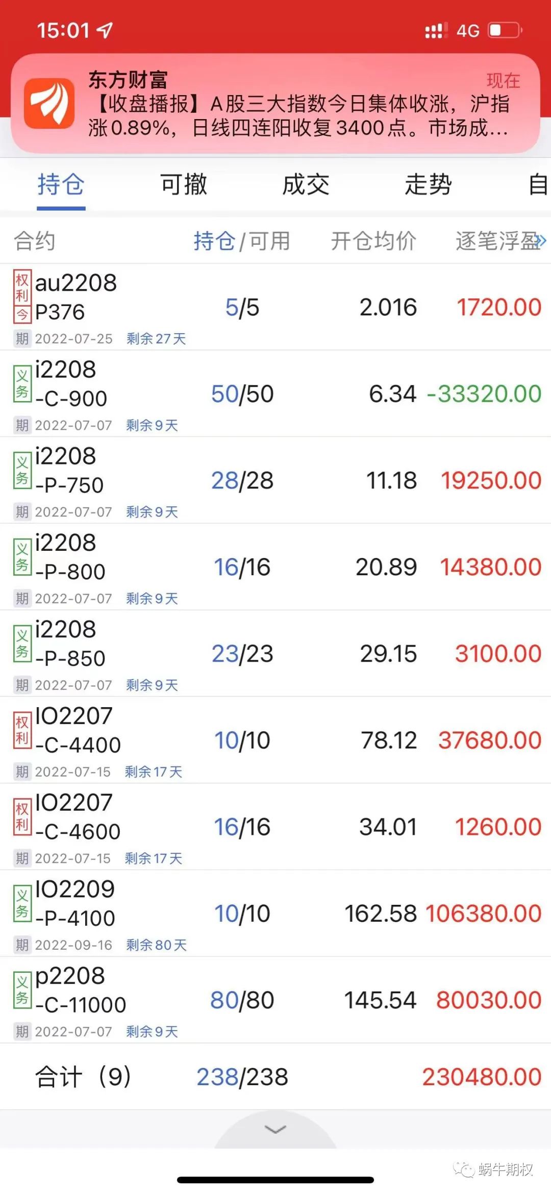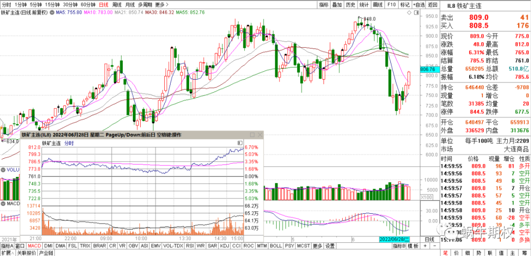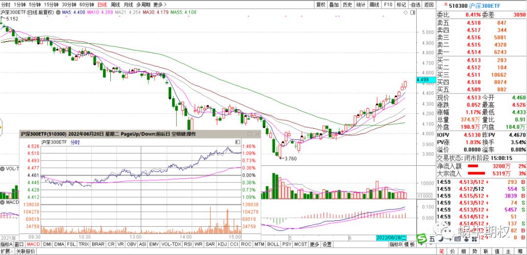 上图中的前两次开黑,都是从该虚值期权站上均线,波动率上升开始的。未雨绸缪,总不会吃大亏。 如果发现危险并未发生,再次开仓就好 卖期权的移仓操作,如果是顺着趋势这个方向,首先要坚信这个趋势还在持续,在卖出的虚值期权、平值期权、实值期权短期内已经收取较多的权利金的情况下,继续持有,较长时间因为下跌的速度变慢,收益金额也不高,则考虑向新的、和原来卖出期权价格差不多的期权合约移仓,如果趋势还在继续,则可以享受新的合约价格快速下降的收益。比如4000元保证金卖出一张500元权利金的期权,当它的价格跌到100元/张时,平仓再卖出下一张500元的期权,等跌到100元/张时,继续卖出下一张500元的期权,如此往复,在趋势性行情里,卖期权一个月的收益可以突破20%。 但是,期权的移仓也要注意顺势追打遭遇反转,行情反转时会快速吞噬之前的利润,这就要做好分批移仓,控制仓位,以及及时控制好回撤,做好止盈止损。 今天的行情盘中快速拉升~~ 收盘问题还不大。