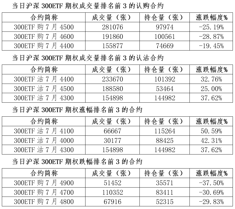 6月29日上证300ETF现货报收于4.458元,下跌1.22%,上证300ETF期权总成交面额1016.492亿元,期现成交比为0.26,权利金成交金额20.343亿元;合约总成交2291997张,较上一交易日增加13.84%,总持仓2021081张,较上一交易日增加1.88%。认沽认购比为0.90(上一交易日认沽认购比0.84)。
