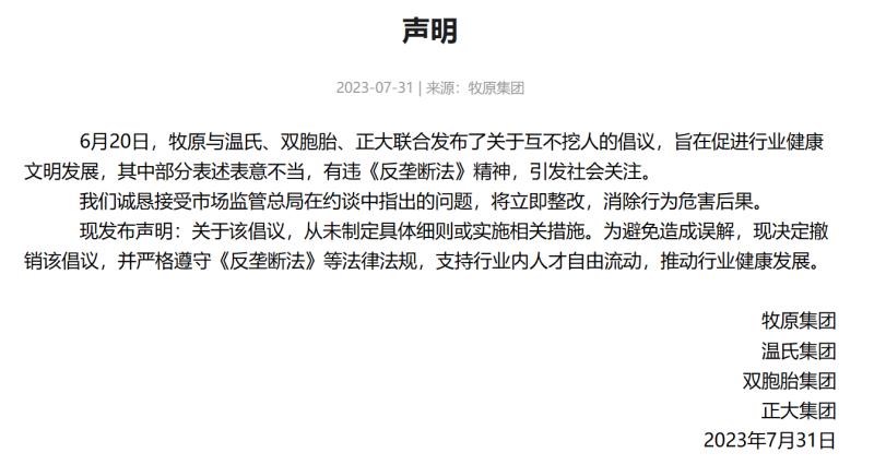 近期,牧原、温氏、双胞胎、正大四家养猪企业联合发布的一份《互不挖人公约》引起热议。7月31日,国家市场监管总局进行约谈之后,四家企业又发布联合声明,宣布撤回该倡议。 从抢人到招人再到留人,《互不挖人公约》的诞生与撤销,也映射出养猪行业的人才现状。业内专家指出,《互不挖人公约》并不具有法律效力,且违背《反垄断法》精神。伴随生猪行业盈利水平的大起大落,行业人才策略也在不断转变,四家企业提出该倡议或许是为自保,但也不应影响市场竞争。 四大养猪巨头被约谈 牧原、温氏、双胞胎、正大在6月20日一场线下活动中联合发布《互不挖人公约》,倡议“不挖人,不拆台,如有违约,加倍反制”。据参会人员称,当日还有多家生猪养殖企业负责人在《互不挖人公约》上签名。 中国生猪预警网首席分析师冯永辉告诉新京报记者,在养猪行业,挖人是很常见的。现今行情下,养猪企业本身压力就比较大,大家都不想刚培养好一个人才就被竞争对手挖走,所以给出这样一个方案。不过,对企业来说,要想把自己的人才留住,光靠约束竞争对手是不够的,这种行为是有悖市场竞争的。 7月31日,国家市场监管总局约谈牧原、温氏、双胞胎、正大,指出上述行为有违《反垄断法》精神,不利于构建全国统一大市场,要求四家企业要重视《互不挖人公约》存在的问题,增强责任意识,坚持依法合规经营。采取有效措施,主动抓好整改,消除行为危害后果,规范自身经营行为;吸取教训,对照《反垄断法》及配套规定排查反垄断合规风险,全面自查自纠;加强合规管理,完善合规制度建设,切实提升反垄断合规意识和能力。 北京市京师律师事务所高级合伙人钟兰安向新京报记者分析,我国《反垄断法》第十六条指出,“本法所称垄断协议,是指排除、限制竞争的协议、决定或者其他协同行为。”从目前披露的信息来看,《互不挖人公约》主要是“不挖人,不拆台,如有违约,加倍反制”,涵盖内容宽泛,没有具体执行程度,很难达成,“所以这份《互不挖人公约》很难具有法律效力”。 钟兰安表示,这份公约虽有各企业负责人签名,但还达不到《反垄断法》所提及的“协议”程度,不能证明是一种明显的违法行为,所以市场监管总局也没有进行处罚,而是选择约谈。 撤回《互不挖人公约》 7月31日,牧原、温氏、双胞胎、正大在市场监管总局约谈后发布联合声明称,互不挖人的倡议“旨在促进行业健康文明发展”,从未制定具体细则或实施相关措施。其中部分表述表意不当,有违《反垄断法》精神,“我们诚恳接受市场监管总局在约谈中指出的问题,将立即整改,消除行为危害后果”。 四家企业表示,为避免造成误解,决定撤销该倡议,并严格遵守《反垄断法》等法律法规,支持行业内人才自由流动,推动行业健康发展。 ![]() 牧原、温氏、双胞胎、正大发布联合声明,宣布撤销互不挖人倡议。 牧原集团官网截图 在钟兰安看来,四家企业联合发布《互不挖人公约》,客观上有行业行情相对疲软、市场主体生存环境变得恶劣、竞争加剧等原因,主观上则是企业间经过沟通,想要减少“内卷”,更好发展。不过这种交流和声明的内容,底线是不能违反法律规定,也不能违反商业道德。这次约谈也体现出部分企业对于法律的认识层次和水平,缺乏相应的法律人士指导和参与,如果能够遵循一些法律专家的意见,事情可能会得到更加妥善地处理。 行业人才争夺激烈 从发布到撤销,《互不挖人公约》引起的风波,其实与养猪行业的人才争夺密切相关。近年来,伴随生猪产能逐渐恢复,一批规模养猪企业崛起,对养殖人才的需求也到了求贤若渴的地步。冯永辉向新京报记者指出,如今规模企业的生猪出栏量已达百万头、千万头级别,相应也就需要大量人力来养猪。 有养猪业人士向新京报记者表示,被挖最多的是饲养员、技术场长等生产一线人员,可以给企业省去很多培训成本,更快投入工作。最普遍的做法就是高薪吸引,2019年到2020年,猪价高位期的人才流动最为频繁。新京报记者发现,除一线人员外,部分高管也在2020年更换了东家,双汇前高管游牧、王豪杰入职雨润,新希望前总裁邓成跳槽天邦等,都曾成为业内轰动一时的事件。 猪价高位时期,各家养猪巨头快速扩张,挖掘圈内现有人才已不能满足增产步伐,高薪校招成为很多养猪企业的另一选择。2020年,发展势头正猛的正邦在全国范围招聘2.5万名大学生,专科生入职第一年的综合薪资为8万—15万元,本科生为12万—20万元,硕士为18万—30万元,博士为30万元起。 冯永辉指出,新人普遍没有实践经验,而规模养猪企业在管理、技术等方面又相对规范。所以,企业要在新人身上投入大量时间、练习、实践经验等成本,等他们在各类猪场锻炼两三年后,成为技术相对成熟的人才。这些人才一旦培养出来,创造的价值会让企业效益不断提升,成本也会不断降低。但现实是,好不容易培养好的人,可能转头就被竞争对手挖走,企业白白交付“学费”。 冯永辉还提到,规模企业都有现代化设备,有些岗位人员通过设备能管成百上千头猪,所以对一些企业来说,挖人这一行为,不但能帮自己稳定生产,也可以打压竞争对手。上述《互不挖人公约》也可能是为了避免这种恶性竞争的出现。 人才策略开始转变 因前期各家产能大举扩张,近两年生猪供给充裕,猪价不断回落,一度跌至成本线