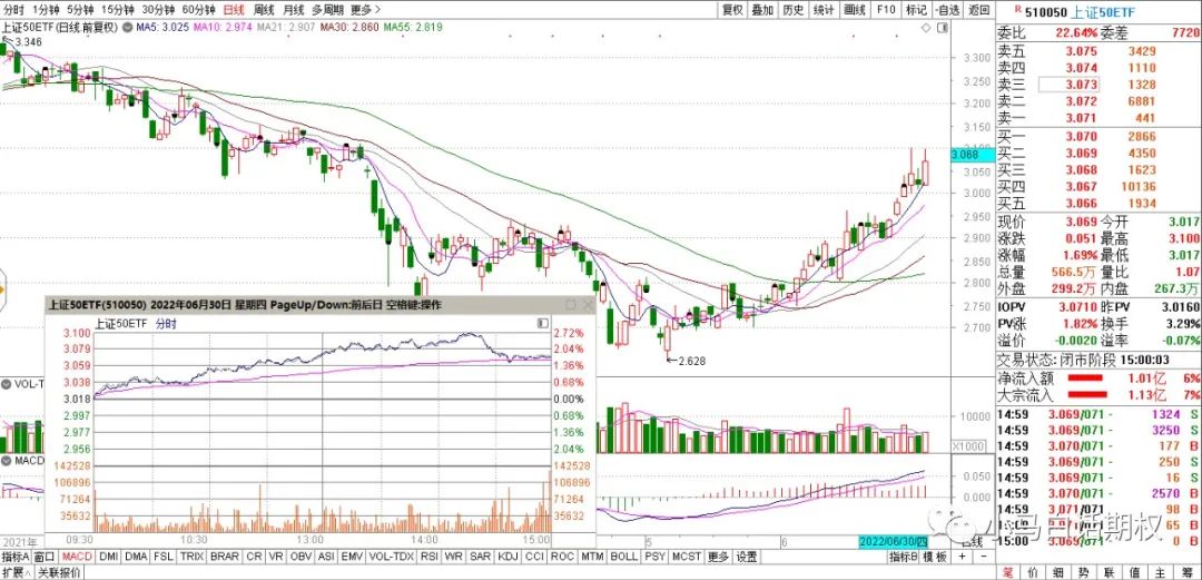 50ETF那天是乌龙指还是仙人指? 小马 06月30日 大家还记得前天,50ETF突然在盘中瞬间来了30万手的大单,价格为3.1元,当时还在琢磨,这是乌龙指买错了呢,还是仙人指路,表示未来有所行动呢,今天,最高价格在此来到3.1元,并且是稳步推进的,虽然尾盘有所回落,但也意有所图吧。 期权究竟如何复盘,都是看什么,要不要在群里猜多猜空,还是耐心看看资金,K线,成分股和板块,欢迎看我几年前录制的视频。 (责任编辑:期权号管家)