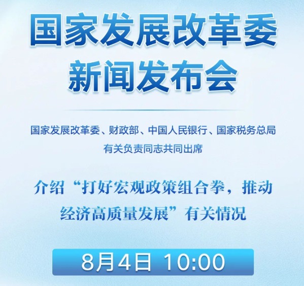 多部委明日联合召开发布会 介绍“打好宏观政策组合拳 推动经济高质量发展”有关情况 界面新闻 08月03日 国家发改委官微8月3日消息,国家发展改革委将于8月4日10:00举行新闻发布会,国家发展改革委、财政部、中国人民银行、国家税务总局有关负责同志共同出席,介绍“打好宏观政策组合拳,推动经济高质量发展”有关情况。(文章来源:界面新闻) (责任编辑:admin)