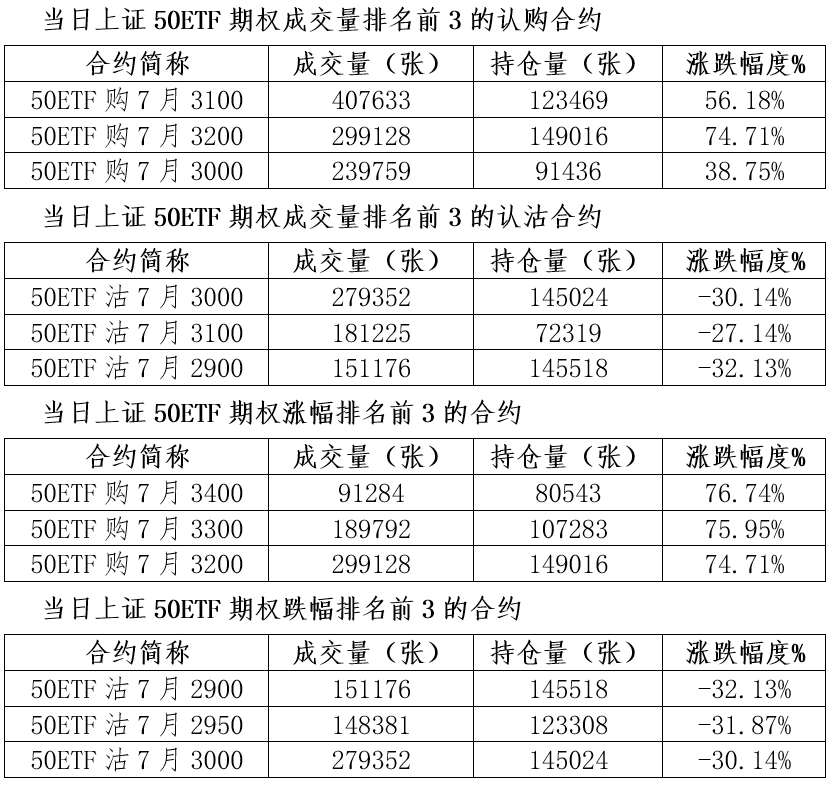 6月30日上证50ETF现货报收于3.069元,上涨1.69%,上证50ETF期权总成交面额937.111亿元,期现成交比为0.26,权利金成交金额18.407亿元;合约总成交3070818张,较上一交易日增加45.91%,总持仓2409403张,较上一交易日增加4.93%。认沽认购比为0.77(上一交易日认沽认购比0.90)。