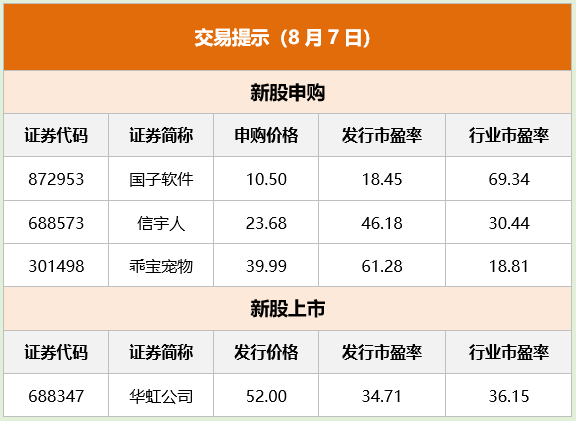1、证券时报:国家发改委、财政部、人民银行、国家税务总局联合召开新闻发布会,介绍“打好宏观政策组合拳,推动经济高质量发展”有关情况。会议要点包括,将研究一批针对性更强、力度更大的储备政策,及时分批出台实施;发挥好货币政策总量和结构双重功能,必要时可再创设新工具;统筹搭配、灵活运用降准等工具;指导银行依法有序调整存量个人住房贷款利率;多项税费优惠政策统一延续实施至2027年底;将在近期公布税费优惠政策后续安排。 2、国家发改委:组织召开部门座谈会,研究讨论促进城乡居民增收的政策举措。下一步,发改委将会同有关部门研究制定政策措施,促进低收入群众增收,扩大中等收入群体。 3、中国结算:拟自2023年10月起进一步降低股票类业务最低结算备付金缴纳比例,将该比例由现行的16%调降至平均接近13%,并正式实施股票类业务最低结算备付金缴纳比例差异化安排。具体为,根据结算参与人的资金收付时点设定不同的缴纳比例,其中结算参与人可就托管业务向中国结算自主申报选择适用差异化或固定最低结算备付金比例计收方式。 4、中国证券报:“股神”巴菲特旗下伯克希尔-哈撒韦披露2023年二季度财务报告。伯克希尔二季度实现营收925.03亿美元,去年同期为762.01亿美元;实现归属于股东的净利润359.12亿美元,去年同期为亏损436.21亿美元。与二季度的经营业绩一同披露的,还有最新重仓股名单。截至二季度末,伯克希尔持仓市值居前的五只股票并未发生变化,依然是苹果、美国银行、美国运通、可口可乐、雪佛龙。 5、财联社:半导体“巨无霸”华虹公司于8月7日正式登陆科创板。根据发行公告,华虹公司本次发行价为52.00元/股,发行市盈率为34.71倍,预计募集资金总额为212.03亿元。此次成功发行后,华虹公司成为A股今年以来最大募资规模IPO。同时,公司也是截至目前科创板募资规模排名第三的IPO,其募资额仅次于此前中芯国际的532.3亿元和百济神州的221.6亿元。