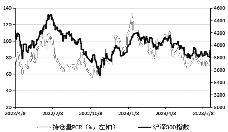 图为沪深300指数期权隐含波动率与标的价格 A指数重心上移 受7月中央政治局会议中“适时放宽房地产政策、活跃资本市场”等利好因素影响,7月下旬以来,A股市场情绪回升明显,与国内宏观环境密切相关的上证50和沪深300两大指数出现大幅上行,月度收益率分别达到6.47%和4.48%。市场的交易逻辑亦由前期的“弱预期、弱现实”逐步转化为“强预期、弱现实”。后市行情将如何演变,下面我们进行一一分析。 首先,当前市场依旧处于存量博弈格局,增量资金整体略显不足。一方面,今年以来证券新增开户数同比增速持续处于负值区间,公募偏股型基金发行份额亦大幅回落,其占全市场基金比例已与去年11月和12月水平相当。另一方面,以融资余额为代表的杠杆资金自4月以来亦持续下降,即使在7月底市场的大涨中两融资金亦表现得较为谨慎。 其次,从成交额与换手率上看前期悲观情绪定价整体较为充分。在前期7月中上旬市场的振荡盘整行情中,两市日成交额不断回落,最低触及6600亿元左右,该值几乎触及了近一年7%分位左右极低水平,存量博弈格局中交易量的触底往往预示着市场的暂时出清。同时,两市市值换手率在7月市场振荡之中最低触及了1.77%左右的低位,2020年以来市值换手率仅有3次跌破了1.8%,其中有两次在之后的一至二个月沪深300指数市场均出现了明显的回升。从这个角度上看,7月市场的低点或将是未来一至两个月的低点。 最后,当前各指数估值依旧偏低。沪深300指数、中证500指数和中证1000指数市盈率分别处于近五年35%分位、49%分位和46%分位左右的中等偏低水平,沪深300指数股债性价比自5月底以来持续处于历史一倍标准差至两倍标准差之间,尽管7月底市场经历了明显的反弹,但目前依旧处于历史高位区域。从该角度上看,A股市场中长期依旧具有较优的投资价值。 此外,从板块上看,此波上证50和沪深300指数的大幅上行,主要源于非银金融和地产的带动,从量能上看,当前这两个板块周度成交量已经触及历史95%分位以上极高区域,存量博弈下后期继续放量上行的难度加大,受此影响短期指数继续上行空间亦将较为有限。 综合而言,前期市场悲观情绪定价较为充分,随着国内政策不断发力,经济复苏预期再度加强,后期市场情绪仍旧具有回升空间,但当前市场增量资金依旧不足,以两融为代表的杠杆资金依旧谨慎,且技术上沪深300指数中长期20月均线仍处于下行趋势之中,中期4100点之上依旧存在明显压力,我们判断当前市场依旧处于区间振荡的大格局之中,但振荡重心或逐步上行。 B成交持仓分析 成交量PCR值显示投资者对标的指数偏乐观 股指期权成交量PCR(看跌成交量与看涨成交量比值)与标的指数短期呈现略微负相关关系,该指标一般站在买方的角度进行观察,因其包含较多的日内交易,持仓时间相对较短,这较为符合期权买方的特征。 7月以来上证50指数期权日均成交量4.67万张,日均成交额14476万元,相比前一个月分别上升6.05%和6.04%;沪深300指数期权日均成交量10.43万张,日均成交额48761.9万元,相比前一个月分别上涨16.29%和12.6%。中证1000指数期权日均成交量6.6万张,日均成交额42095.2万元,相比前一月分别上涨9.26%和7.86%。随着标的指数市场波动的放大,三大指数期权成交量和成交额均有明显回升。从成交PCR值上看,上证50指数期权7月以来成交PCR均值在62.23%,沪深300指数期权在70.72%,中证1000指数期权在87.28%,分别环比回落7.9个百分点、8个百分点和10个百分点左右。日内买入看跌期权进行避险的投资者比例有明显下降,投资者对未来三大指数表现整体偏乐观。 从持仓PCR值看市场情绪触底回升 股指期权上市以来,持仓量PCR值(看跌期权持仓量与看涨期权持仓量比值)与标的指数整体呈现相对明显的正相关性,该指标一般站在期权卖方的角度进行分析,因卖方持仓时间相对更长,且占用资金更大。 7月以来,上证50、沪深300和中证1000指数期权日均持仓量分别在9.72万张、19.22万张和9.3万张,环比分别上涨19.06%、11.97%和6.1%,上证50指数期权持仓量依旧处于明显上升趋势之中,且持仓时间更长的机构资金入市相对更快。 从持仓PCR值上看,沪深300指数期权持仓PCR值呈现明显触底回升走势,最低在69%左右,最高回升至82%左右,卖出看跌期权投资者比例有明显上涨。此轮持仓PCR值的振荡回落起始于4月中旬左右,至今已3月有余,从历史统计数据上看此波持仓PCR值回落时间已基本足够,从该角度看当前沪深300指数具备振荡回升的基本条件,未来一至两个月指数再度出现大幅回落的概率整体较低。 持仓分布显示下方支撑较为明显 期权持仓量的分布能够一定程度上代表主力机构对后市标的期货的看法,如看跌期权某一行权价格的持仓量高,代表在该行权价处标的期货价格具有较强的支撑。因期权卖方资金量较大,市场的走势一般掌握在他们手中。 一方面,沪深300指数期权8月看涨期权持仓最高合约集中在行权价4000点和4100点处,且在标的指数的反弹过程中,后者呈现出明显的单边增仓趋势,卖出该合约投资者明显增多,预计短期沪深300指数上破4100点的概率整体较小。 另一方面,下方看跌期权持仓高点则在行权价3900点和3850点处,预计指数在该区域亦存在明显支撑。从更远期的9月合约持仓分布上看,行权价为3700点IO看跌期权持仓极高,且该种现象已持续俩月有余,对于中远期而言,卖方认为沪深300指数在3700