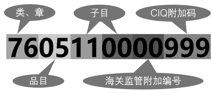 图为海关13位编码的结构 1992年起中国海关采用HS编码,2018年中国出入境检验检疫部门正式并入中国海关后,编码增为13位数字。其中,第1—8位是以协调制度为基础编制的《中华人民共和国进出口税则》和《中华人民共和国海关统计商品目录》确定的商品编码;第9位、第10位是海关监管附加编号;第11—13位是CIQ附加码,是检验检疫附加编号。申请报关时,须填写最新的13位HS编码。 HS编码共22大类(第72—83章)。其中,第15大类为贱金属及其制品,包含钢铁和铜、铝、铅、锌、锡等有色金属。铝及其制品主要位于HS编码的第76章。