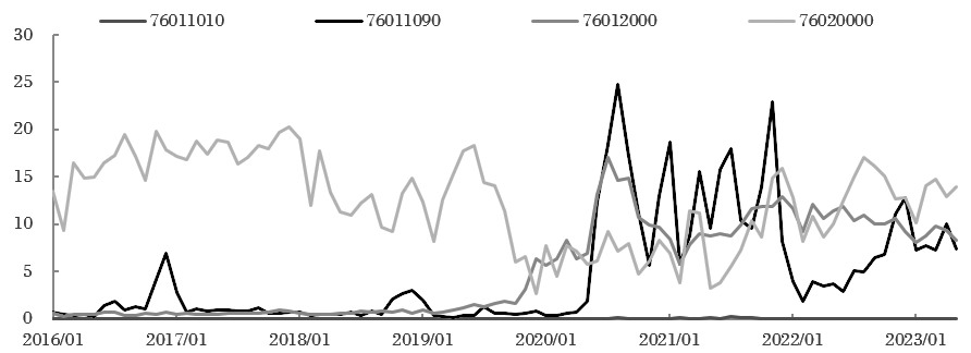 图为2022年铝及其制品进口结构 进口品目主要看未锻轧铝和废铝。2020—2021年铝进口利润窗口打开,印度、俄罗斯、马来西亚贡献了未锻轧铝的主要进口增量。俄罗斯、马来西亚期初贡献主要进口增量。2021年年底进口窗口关闭,印度的未锻轧铝进口锐减。随后俄乌发生冲突,俄铝遭到西方抵制,我国对俄罗斯未锻轧铝进口快速增长。从进口利润图可以看到,俄罗斯铝锭进口量增加主要是因为进口窗口打开,挤压了其他国家和地区的铝锭进口,而非带来超额进口。而对于废铝,美国贡献了主要进口减量,马来西亚、日本贡献了主要进口增量。 进一步,将第76章16个品目分为未锻轧铝(包括铝合金)、废铝、铝材、铝制品四大类进行分析。 出口方面,过去我国是铝材净进口国,如今我国铝材产量占到全球铝材产量一半以上,且铝材及铝制品出口量呈现增长态势。我国出口以铝材为主,然后是铝制品。未锻轧铝(包括铝合金)基于内外价差进行贸易,去年上半年欧洲发生能源危机,未锻轧铝(包括铝合金)的出口窗口短暂打开,但出口整体呈现减少趋势。铝材贡献了铝及其制品出口的主要增量,铝制品出口缓慢增长且相对平稳。 进口方面,我国进口以废铝为主,然后是未锻轧铝(包括铝合金)。铝材进口量较小且较为稳定,铝制品进口非常小,可忽略不计。 前文已经分析了未锻轧铝(包括铝合金)和废铝分国家和地区的情况,这里进一步分析我国铝材、铝制品分国家和地区的情况。 我国铝材的出口较为分散,不存在非常集中的国家,近些年铝材出口占比最高的美国也仅占到7%。我国铝制品的出口也比较分散,但美国占比达到17%,然后是日本、澳大利亚等国家。 子目分析 具体到子目来看,我们主要关注7601全部下属子目76011010(含铝量≥99.95%的未锻轧非合金铝)、76011090(含铝量<99.95%但≥90%的未锻轧非合金铝)、76012000(铝合金),和7602唯一下属子目76020000(废铝)?。这四个子目具有一定的联系和研究意义:未锻轧铝(包括铝合金)7601分为非合金铝760110(含铝量≥99%,且其他各种元素的含量不超过规定),铝合金760120。其中,非合金铝760110包括76011010(含铝量≥99.95%的未锻轧非合金铝),76011020(含铝量<99.95%但≥90%的未锻轧非合金铝)。760120不仅包括原生铝合金,还包括再生铝合金,而铝废碎料归类为废铝7602。 可以看到,2018年废铝进口政策趋严后,废铝进口量逐步减少,但铝合金在2019年年底即开始逐步增长。这是因为由于进口政策限制,企业选择直接进口无政策限制的废铝再生加工铝锭,统计入7601下属76012000。在2020年年底废铝进口政策放宽后,铝合金和废铝共同成为我国再生铝资源进口的两大主要组成部分。