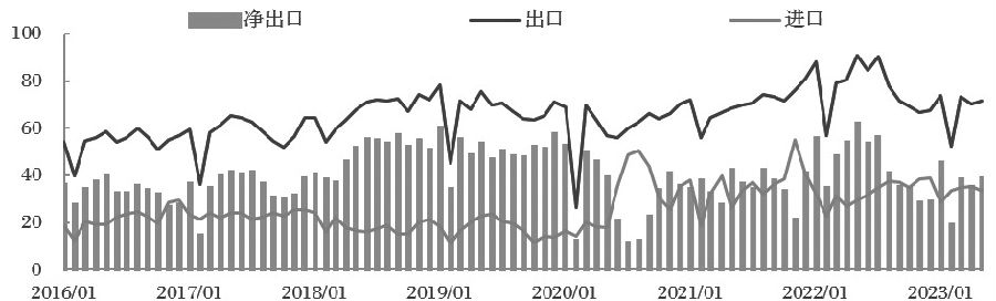 表为第76章铝及其制品的16个子目 根据以上基本信息,我们能够用近年来中国海关数据对我国铝及其制品进出口贸易进行分析。海关编码的第76章铝及其制品共有16个子目。按行业通用分法,可将第76章铝及其制品下全部16个属品目分为四部分:一是未锻轧铝(包括铝合金),二是废铝,三是铝材,四是铝制品。其中,未锻轧铝(包括铝合金)的品目为7601,废铝的品目为7602,铝材的品目包括7603—7609,铝制品的品目包括7610—7616。 值得注意的是,广义的铝及其制品统计在第76章,但光伏铝边框不仅能归类为第76章的761090(其他铝制结构体及其部件)等,也能归类为第85章的854190(品目8541所列货品零件)。因为铝广泛应用于其他章的深加工商品(如汽车等),所以无法完全统计我国铝及其制品的进出口贸易。不过,这种统计上的困难仅限于铝制品和部分铝材,未锻轧铝(包括铝合金)、废铝基本完全统计在第76章(海关未列示部分小型国家和地区的进出口,如2023年增列关岛等),所以第76章仍然具有统计意义。本文仅以第76章作为研究范围,考察我国铝及其制品的进出口贸易格局,下文的铝及其制品均指中国海关编码第76章统计的部分。 [我国铝及其制品进出口贸易发展变化] 本文根据海关总署2016—2023年第76章分国家和地区的月度统计数据,对我国铝及其制品进出口贸易的章、品目、子目进行逐层分析。 章分析 我国铝及其制品出口量呈现逐年缓慢增加态势。进口量较为平稳,2016—2019年呈现轻微减少趋势,2020年上半年内需恢复较快,但海外经济下行导致外部需求减少。