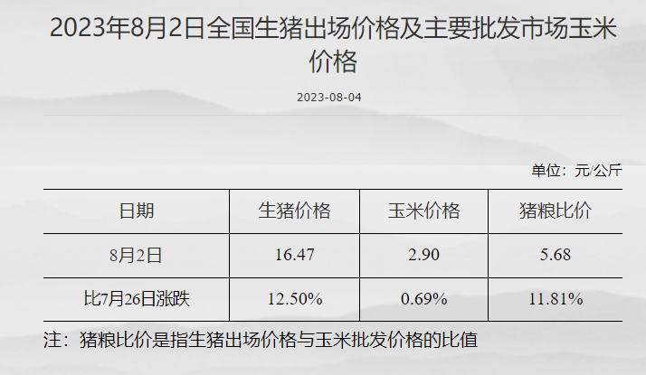 猪粮比价为5.68 比7月26日上升11.81% 发改委网站 08月07日 截至8月2日,全国生猪出场价格为16.47元/公斤,比7月26日上升12.50%;主要批发市场玉米价格为2.90元/公斤,比7月26日上升0.69%;猪粮比价为5.68,比7月26日上升11.81%。 (文章来源:发改委网站) (责任编辑:admin)