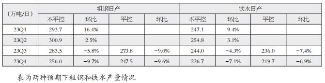 图为两种预期下下半年粗钢日产情况 B粗钢主产省生产情况 国家统计局发布的数据显示,上半年全国粗钢产量为53564万吨,同比增长1.3%。虽然按照粗钢累计产量直接计算的同比增速为1.7%,上半年粗钢产量同比应是增产876万吨,但考虑到官方口径历史数据存在调整的可能性,故我们直接参考国家统计局的累计同比增速口径,按照上半年粗钢产量增长1.3%来进行测算。理论上,下半年全国粗钢产量只要同比下降约700万吨,就能完成全年的平控任务,但各主产省的具体情况存在较大差异。 众所周知,我国粗钢生产集中度较高。根据国家统计局口的数据,2022年产量前五的主产省河北、江苏、辽宁、山东和山西的合计粗钢产量达到全国的54%之多。尤其是第一主产省河北,粗钢产量占全国的比重高达21%。结合上半年各省的粗钢产量数据来看,基本上这几个主产省就是平控压力最显著的区域了。 除了上半年因累库过多而主动减产去库的山西(同比减产97万吨,折合2.7%)以外,其他四个主产省粗钢产量全部表现为增加。单纯从产量增量来看,河北、江苏和山东增量较多,分别增产499万吨、144万吨和131万吨;再考虑到增长率,河北、山东增幅较大,分别增长为4.5%和3.6%,这两个省下半年平控压力明显较大。当然,平控压力最大的主产省仍然是河北,尤其是占河北粗钢产量六成左右的唐山市。 近期,受到大气污染治理目标的直接影响,唐山市烧结、轧材、高炉环节的环保限产要求收严,导致7月下旬铁水产量下滑约4万吨/日。此外,据了解,部分大型国有钢铁集团已经开始布局产量平控任务。 C粗钢及铁水日产预测 即便不出台粗钢平控政策,7—8月全国粗钢产量也会随着需求的季节性回落而下降,但后续利润和产量的波动都较小,全年粗钢产量大约增加1600万吨。而如果出台粗钢平控政策,那么按照下半年全国粗钢产量同比小幅下降的思路进行预测,再结合当前炼钢行业利润微薄以及需求呈季节性特征,7—9月全国粗钢平控的任务并不算重,主要压力会集中于四季度,尤其是11—12月,粗钢日产要降至240万吨。届时,像唐山等重要区域的实际减产力度值得关注。 预计今年粗钢需求基本持平去年,需求端并不支持钢价突破窄幅振荡区间。在这样的背景下,全国废钢供应预计稍有下降,全年电炉钢产量提供约500万吨的供应减量,但这部分供应减量已经在上半年全部完成。在下半年电炉钢产量低基数的基础上,三、四季度粗钢产量下降将体现为铁水产量收缩。结合对粗钢日产的节奏预测,7—9月全国铁水仍会保持240万吨/日以上(对应mysteel口径约230万吨/日)的高产水平,到10月才进入产量骤降阶段。如果不进行平控,那么10—12月铁水产量预计处于220万—240万吨/日的区间内;如果进行平控,那么10—12月铁水产量需要降至210万—230万吨/日的区间内。 总结来看,若不进行粗钢平控,则全年粗钢产量增幅可达1600万吨,粗钢供需基本匹配,钢材市场仅小幅累库,对应的三、四季度铁水产量环比下降4.3%和7.1%,同比则增长2.5%和0.3%,钢材价格高度和炼钢利润都继续承压。若进行粗钢平控,则下半年粗钢产量小幅下降,粗钢平控压力集中于河北和山东,对应的三、四季度的铁水产量环比下滑7.4%和6.9%,炼钢利润自三季度开始扩张。