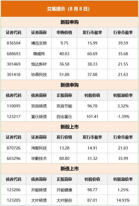 华虹公司:8月7日上市,首次公开发行股份数量4.08亿股,本次发行全部为新股,无老股转让,发行价52元/股。公司是特色工艺晶圆代工龙头,产能规模居中国大陆第二,本次募资规模高达212亿元,不仅是A股年内最大,也是科创板史上第三大IPO。 贵州茅台:出资参与设立的两只产业发展基金于近日成立,分别为茅台招华基金与茅台金石基金,两只基金总规模超过110亿元,前者系与招商局旗下招商局资本控股有限责任公司(招商局资本)共同成立,后者则与中信证券旗下金石投资共同设立。 阳光电源:预计上半年营业收入260-300亿元,同比增长112%-144%,预计归母净利润40-45亿元,同比增长344%-400%。报告期内,全球新能源市场保持快速增长,公司市场领先地位进一步提升,光伏逆变器和储能系统等核心产品收入同比大幅增长。 百利电气:不涉及“室温超导”相关业务,也未筹划开展相关研发和投入。公司下属控股子公司北京英纳超导技术有限公司从事铋系高温超导线材的研发生产,与“室温超导”无关。 三诺生物:拟以8000万元-1.5亿元回购股份,回购价格不超过35元/股,本次回购股份用于员工持股计划或者股权激励。 云南白药:近日,公司智慧科技业务单元(BU)正式启动运作并聘用相关人员。智慧科技业务单元(BU)致力于为云南白药打造全球数字化平台,提高公司自主和协同创新能力,探索医药行业专业场景与前沿数字化技术的深度融合。 玲珑轮胎:公司目前半钢在手订单充足;塞尔维亚半钢计划9月份进行试生产;预计三季度半钢订单仍然供不应求,产能利用率继续超产能,全钢产能利用率自9月份开始将逐步向好。 赛力斯:为强化和华为联合业务,双方成立了“AITO问界销服联合工作组”,全面负责营销、销售、交付、服务、渠道等业务的端到端闭环管理。 牧原股份:7月,销售生猪570.0万头(其中商品猪557.6万头,仔猪10.1万头,种猪2.3万头),销售收入93.45亿元。商品猪销售均价13.81元/公斤,环比下降0.07%。 盐湖股份:依托察尔汗盐湖丰富的资源进行开发利用,察尔汗盐湖是中国最大的可溶钾镁盐矿床,公司目前以钾、锂开采为主,已形成年产500万吨氯化钾和3万吨碳酸锂的生产规模,同时在其他元素的开采上在技术攻关。 华为:华为常务董事余承东发布消息称,华为智选车业务首款纯电轿跑,将会第一个搭载HarmonyOS 4。据悉,上述新车是华为和奇瑞汽车合作的首款智选车型。余承东表示,该车型将在本季度与大家见面。目前,华为正与多家汽车公司合作,意图成立一个由华为主导的生态品牌联盟,和华为达成智选车合作模式的车企有4家。