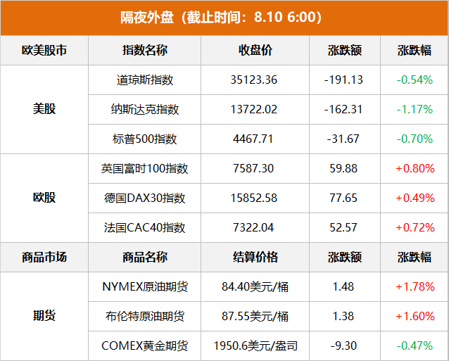 美股:标普500指数收跌31.67点,跌幅0.70%,报4467.71点。道指收跌191.13点,跌幅0.54%,报35123.36点。纳指收跌162.31点,跌幅1.17%,报13722.02点。 欧股:德国DAX 30指数收涨0.49%,报15852.58点。法国CAC 40指数收涨0.72%,报7322.04点。英国富时100指数收涨0.80%,报7587.30点 亚太股市:8月9日,香港恒生指数收涨0.32%,报19246.03点;恒生科技指数收跌0.01%,报4373.71点;日经225指数收跌0.40%,报32225.50点。韩国KOSPI指数收涨1.21%,报2605.15点。 美联储:宣布了一项新计划,以加强对银行参与数字资产的监管。要求州银行在发行、持有或交易稳定币以促进支付之前,必须获得美联储的批准。这些银行必须证明有适当的措施来降低风险,包括流动性、网络安全和非法融资风险,并持续监控这些问题。 WeWork:继续运营的能力存在“重大疑问”,当前面临持续亏损和办公空间会员不断取消租约的处境。未来12个月,将专注于降低租金成本、增加收入和筹集资金。作为共享办公空间的头部企业,似乎陷入了持续亏损的怪圈,已连续4年亏损,累计总亏损金额达144.9亿美元。 穆迪:10家美国中小银行信用评级下调一级,并将纽约梅隆银行、美国合众银行、道富银行、北方信托银行等6家美国大型银行的信用评级列入下调观察名单。将第一资本银行、公民金融集团公司、五三银行等11家美国大型银行的展望评级降为负面。 澎湃新闻:目前,美国有将近900个学区采用的是每周四天的学术时间表。这一数字从2020年的650个上升到2023年的876个,这些学区分布在全美26个州。