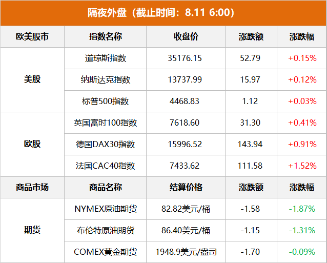 美股:标普500指数收涨1.12点,涨幅0.03%,报4468.83点。道指收涨52.79点,涨幅0.15%,报35176.15点。纳指收涨15.97点,涨幅0.12%,报13737.99点。 欧股:德国DAX 30指数收涨0.91%,连续第二个交易日上涨,报15996.52点。法国CAC 40指数收涨1.52%,报7433.62点。英国富时100指数收涨0.41%,报7618.60点。 亚太股市:8月10日,香港恒生指数收涨0.01%,报19248.26点;恒生科技指数收涨0.1%,报4378.04点;日经225指数收涨0.87%,报32507.00点。韩国KOSPI指数收跌0.15%,报2601.22点。 澎湃新闻:美东时间8月9日,英伟达CEO黄仁勋发布了新一代GH200超级芯片后的第二天,英伟达股价低开低走,最高跌幅达5.66%,全日收于425.54美元,跌4.72%,创下自7月11日以来近一个月内的新低,总市值1.05万亿美元,一夜缩水521.17亿美元。随着AI在今年火爆全球,英伟达也成为了从中获得最高受益的科技巨头之一。数据显示,英伟达2023年以来涨幅接近200%。 环球网:在美国总统拜登于当地时间8月9日签署关于“对华投资限制”行政命令后,英国首相苏纳克考虑跟随拜登限制对中国的科技投资,并就此咨询本国商业和金融业人士的意见。 韩国经济日报:Arm计划9月赴美IPO,包括苹果、三星、英伟达等公司将对其投资。但三星对Arm的IPO案其实缺乏兴趣,认为其估值过高。目前Arm市值超过600亿美元,估值也比营收高约22倍,远多于半导体同行。