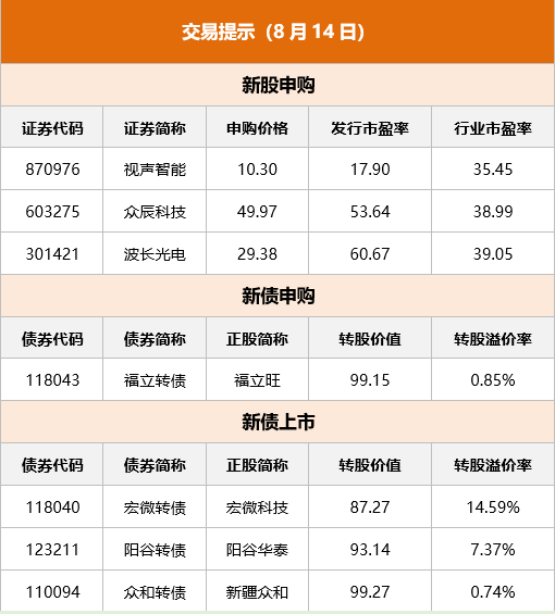 碧桂园:因近期拟就公司债券兑付安排事项召开债券持有人会议,根据相关规定,经公司申请,16腾越02、19碧地03、20碧地03、20碧地04、21碧地01、21碧地02、21碧地03、21碧地04、22碧地02和22碧地03公司债券自2023年8月14日开市起停牌,复牌时间另行确定。 华为:上半年,公司实现销售收入3109亿元人民币,同比增长3.1%,净利润率15.0%。其中,ICT基础设施业务收入为1672亿元人民币,终端业务收入为1035亿元人民币,云计算业务收入为241亿元人民币,数字能源业务收入为242亿元人民币,智能汽车解决方案业务收入为10亿元人民币。 中金公司:持股4.08%的股东海尔集团(青岛)金盈控股有限公司根据自身发展需要,计划通过集中竞价交易方式或大宗交易方式减持合计不超过1.45亿股公司A股股份,占不超过公司总股本的3%。 哈投股份:持股10.89%的股东黑龙江省大正投资集团有限责任公司计划通过集中竞价交易方式减持不超过4161.14万股,不超过公司总股份的2%。 光大信托:就近日网络流传的关于光大信托产品兑付的不实言论,我司作出严正申明,公司管理的信托产品运营正常,均按照信托合同约定进行管理和信托利益分配,对于不实言论和传言公司将依法保留追究法律责任的权利。 五矿信托:近日,公司监测到“五矿信托产品停兑”的相关不实言论,公司对此高度重视,已就不实言论采取法律手段,追究造谣者法律责任,以维护公司合法权益。 中航信托:针对近日互联网造谣者发布的有关公司的不实信息,公司高度重视,已向公安机关报案,将采取法律手段维护公司合法权益。中航信托称运行一切正常。 科大讯飞:上半年营业收入78.42亿元,同比下降2.26%;净利润7357.2万元,同比下降73.54%。主要原因系公司应对美国极限施压,在核心技术自主可控和产业链可控等方面坚定投入的同时,积极抢抓通用人工智能的历史新机遇,加大通用人工智能认知大模型的战略投入。