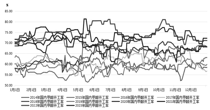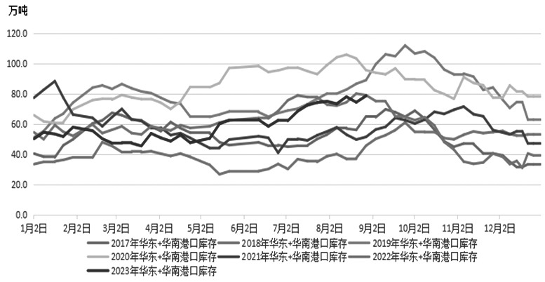 图为2014—2023年国内甲醇开工率走势 7月下旬以来,国内甲醇装置整体检修不多,部分前期检修装置陆续恢复生产,叠加近期国内甲醇行业利润小幅改善,部分企业开工意愿较强,导致甲醇开工率小幅走高。截至8月11日当周,国内甲醇平均开工率维持在72.72%,较7月周度开工率均值70.25%小幅回升2.47个百分点。实际产量方面,1—6月,国内甲醇周度平均产量为155.52万吨,同比小幅下滑3.96万吨。截至8月11日当周,我国甲醇周度产量为160.89万吨,较7月周度产量均值156.79万吨小幅增加4.10万吨。笔者预计,8—9月,国内甲醇供应将维持小幅增加节奏。 [国外新增装置投产时间推迟] 进口方面,7月以来,我国甲醇进口缩量,海外甲醇生产国因长约谈判僵持,以及受到阶段性台风天气的影响,装船和发船节奏有所趋缓。同时,华东一带船舶卸货缓慢,导致7月甲醇进口量下降至125万吨附近。在国外新增装置投产时间推迟的预期下,下半年甲醇进口量较难有明显增加。一方面,考虑到下半年国外需求存在回暖预期,主力生产国将再度缩减销售半径,抵达中国的货物可能会缩减;另一方面,从往年国外装置运行情况来看,受到原料供应问题等因素影响,四季度国外集中停车检修装置较多,这将对我国甲醇进口量造成一定影响。笔者预计,7—12月,甲醇进口量料为630万吨,较上半年变化不大,较去年同期上涨1.85%。 库存方面,在外部进口压力趋增的背景下,我国港口库存转入累积阶段。截至8月10日当周,我国华东、华南地区的港口甲醇库存量维持在78.45万吨,周环比小幅回升4.18万吨,月环比小幅反弹3.56万吨,较去年同期增加3.42万吨。其中,华东港口甲醇库存达54.30万吨,周环比增加0.33万吨;华南港口甲醇库存达24.15万吨,周环比增加3.85万吨。
