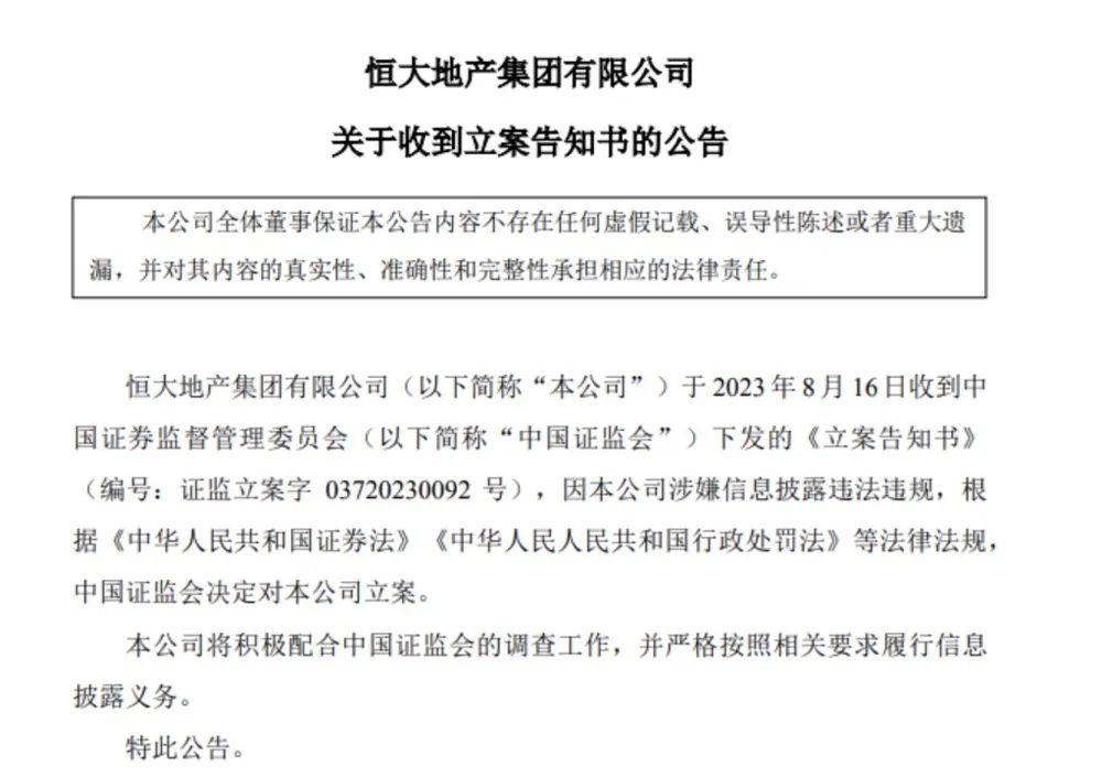 最近,关于恒大的消息不断。 8月16日,恒大地产集团有限公司(简称“恒大地产”)在上交所发布公告称,涉嫌信息披露违规,被证监会立案调查。 与此同时,当日晚间,中国恒大在港交所发布公告称,为让恒大协议安排下的债权人有时间考虑拟议认购及其对恒大协议安排债权人的影响,公司决定延期并重新召开恒大协议安排会议。 恒大地产被证监会立案调查 8月16日,恒大地产在上交所发布公告称,公司于8月16日收到中国证监会下发的《立案告知书》,因公司涉嫌信息披露违法违规,中国证监会决定对公司立案。公司表示将积极配合中国证监会的调查工作,并严格按照相关要求履行信息披露义务。 ![]() 据了解,随着监管层大力规范公司治理和信息披露,信披违规已成为近年上市公司被立案调查的主要原因。 此前,恒大地产在8月10日连发多份财报。财报数据显示,恒大地产2022年度净亏损人民币527.20亿元,截至2022年12月31日,流动负债合计人民币16,787.47亿元,而公司的货币资金总额为人民币91.73亿元。公司总负债18,338.19亿元,总资产14,685.57亿元,已资不抵债。 中国恒大:延期并重新召开恒大协议安排会议 中国恒大16日晚间在港交所公告,为让恒大协议安排下的债权人有时间考虑拟议认购及其对恒大协议安排债权人的影响,公司决定延期并重新召开恒大协议安排会议,同时延期并重新召开景程协议安排会议及天基协议安排会议,以便与延期并重新召开的恒大协议安排会的时间安排保持一致。 据公告,香港恒大A类协议安排会议将延期至2023年8月28日下午八时正举行,香港恒大C类协议安排会议将延期至2023年8月28日下午九时三十分举行。A类债权人的开曼群岛恒大协议安排会议将延期至2023年8月28日下午八时四十五分举行,C类债权人的开曼群岛恒大协议安排会议将延期至2023年8月28日下午十时十五分举行。 日前,中国恒大也补发了2021年度、2022年度及2022年中期业绩公告。从财报中可以看到,中国恒大仍面临严峻的业绩压力。其中,2021年中国恒大全年收入为2500.1亿元,毛亏损184.5亿元,净亏损合计6862.2亿元。进入2022年,中国恒大亏损有所缩减。当年,中国恒大录得收入为2300.7亿元,毛利249.9亿元;年内经营性亏损433.9亿元,土地被收回有关的亏损、金融资产减值损失及其他非经营性亏损693.7亿元,所得税开支130.5亿元,净亏损合计1258.1亿元。 在负债方面,截至2022年年底,中国恒大负债总额24374.1亿元,剔除合约负债7210.2亿元后为17163.9亿元。截至2022年底,中国恒大持有资产总值1.84万亿元,其中开发中的物业为主要项目,金额高达1.14万亿元,现金及现金等值物仅43.34亿元。中国恒大介绍,截至2022年12月31日,集团拥有土地储备2.1亿平方米。此外,集团还参与旧改项目79个,其中大湾区55个(深圳34个),其他城市24个。 如今,出险房企都将“保交楼”工作放在首位。中国恒大称,庞大优质的土地储备,是集团保交楼、逐步偿清债务、恢复正常经营的坚实基础。中国恒大回顾2022年各业务板块称,公司以最大力度积极推进保交楼工作,实现了732个保交楼项目全面复工,全年累计交楼30.1万套。在业内人士看来,目前距离中国恒大真正实现复牌,还有多项条件有待完成。 许家印离婚传闻刷屏 除了恒大地产和中国恒大的公告,16日白天,有关许家印离婚的消息刷屏网络。 该消息主要源于中国恒大于8月14日晚间公布的一系列公告,除去披露恒大汽车获得外部投资之外,对于许家印妻子丁玉梅的表述,引起市场关注。在公告中,丁玉梅被称为“独立于本公司及其关联人士的第三方”,并未如此前一般被列为许家印的配偶。此前,在中国恒大发布的2021年中期报告中,丁玉梅女士仍然是以“许太太”的名义出现。 中国恒大并未进一步披露两人目前关系。记者就此向恒大方面求证,对方表示“不清楚,没有消息”。腾讯新闻获悉,公司实际控制人婚姻状况仅需在IPO时的招股说明书中进行披露,后续除非发生实际控制人变化,否则可不再进行披露。 相关报道许家印已离婚?恒大回应!法律人士:离婚或无法隔离债务 中国恒大突然宣布:会议延期!恒大地产被立案 (文章来源:证券时报) (责任编辑:admin) |