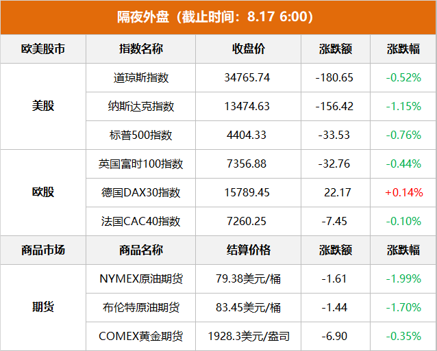 美股:道指收跌0.52%,报34765.74点;纳指收跌1.15%,报13474.63点;标普500指数收跌0.76%,报4404.33点。 欧股:德国DAX 30指数收涨0.14%,报15789.45点。法国CAC 40指数收跌0.10%,报7260.25点。英国富时100指数收跌0.44%,报7356.88点。 亚太股市:8月16日,香港恒生指数收跌1.36%,报18329.3点;恒生科技指数收跌1.27%,报4126.13点。日经225指数收跌1.39%,报31790.00点。韩国KOSPI指数收跌1.76%,报2525.64点。 美联储会议纪要:通胀风险可能要求进一步收紧政策;多数美联储官员认为通胀存在“重大”上行风险;多位与会者警告政策意外过度收紧的风险;美联储内部研究人员撤销对经济衰退的预测,预计失业率小幅上升。 财联社:Vantage Point资产管理公司表示,随着投资者逐渐开始认识到美国经济增长放缓,美股的反弹势头将戛然而止,季节性因素很可能会加剧市场的抛售压力。而在看衰美国市场的同时,该公司也正在从中国股票中寻找机会。 美国副财长Adeyemo:通胀削减法案在推动通胀走低的同时创造了就业岗位,其效果相当于1100亿美元的美国境内投资;拜登总统已提议通过增加3万亿美元额外政府收入来削减美国债务。 德国总理朔尔茨:德国经济正在经历充满挑战的时期;德国经济面对危机时的表现要比预期更好;能源价格仍有必要进一步回落;德国仍能够很好地应对当前的经济问题。